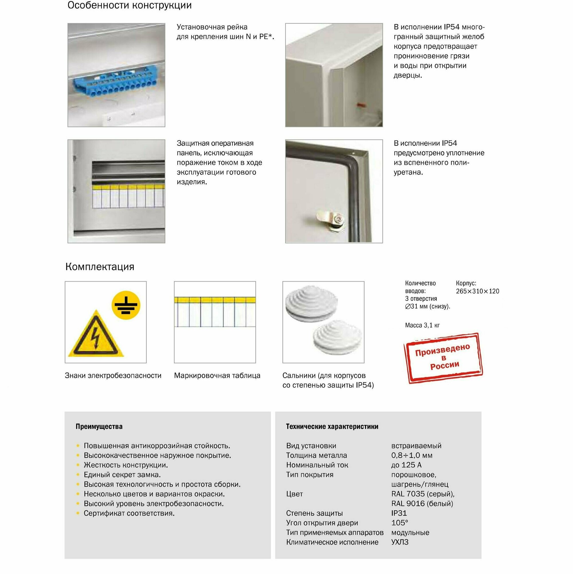 Предназначены для сборки распределительных электрощитов с использованием модульной аппаратуры, для ввода и распределения электроэнергии, а также для защиты сетей напряжением 230/400 В от токов перегрузки и короткого замыкания.
