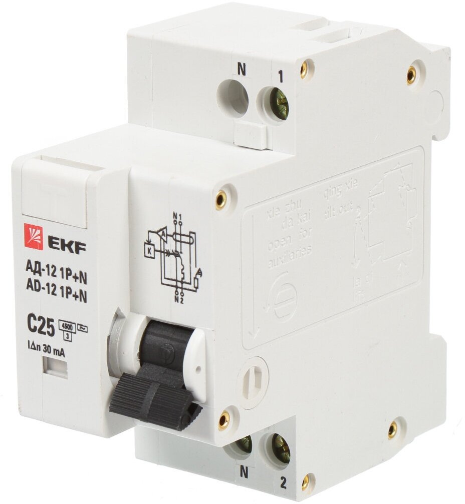 **Дифференциальный автомат EKF АД-12 1P N** предназначен для защиты электроцепей от короткого замыкания, токов перегрузки, защиты человека от токов утечки 30 мА. Обладает компактными габаритами, изготовлен из прочного, негорючего пластика.