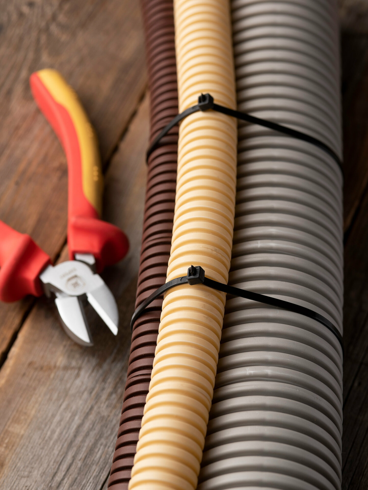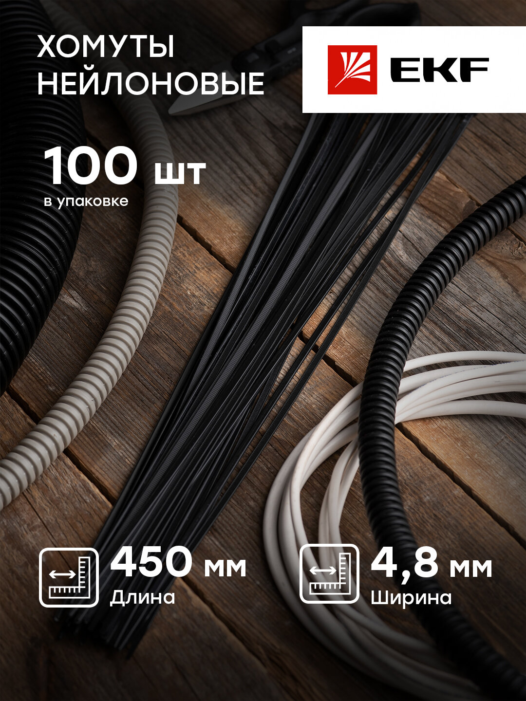 Хомут (стяжка) нейлон 4.8 х 450 черн. (100шт) P6.6 стандарт. Fle x Lock PRO x ima EKF plc-fl-ctsb-4.8.0 х 450 Хомуты серии FlexLock предназначены для увязки кабелей и проводов в пучок и монтажа кабельных линий и проводников. Изготовлены из полиамида 6.6, который обладает хорошей устойчивостью к маслам, смазкам, масляным производным, хлоридным растворителям, устойчивостью к слабым кислотам и УФ-лучам. Кабельные стяжки серии FlexLock имеют самофиксирующийся ремешок с блокирующим механизмом. При производстве кабельных стяжек черного цвета добавляется угольный порошок, который является одним из наиболее эффективных стабилизаторов. Он улучшает физические свойства продукции в стойкости к погодным условиям и УФ-излучению (прямые солнечные лучи). Наборы хомутов в банках представляют собой кабельные стяжки наиболее распространенных габаритов и разных цветов собранных в одной пластиковой упаковке. Благодаря прозрачной пластиковой упаковке такие наборы легко транспортировать и легко идентифицировать какой цвет и габарит хомута находится в упаковке. Разные цвета очень удобны в применении в быту и для маркировки.