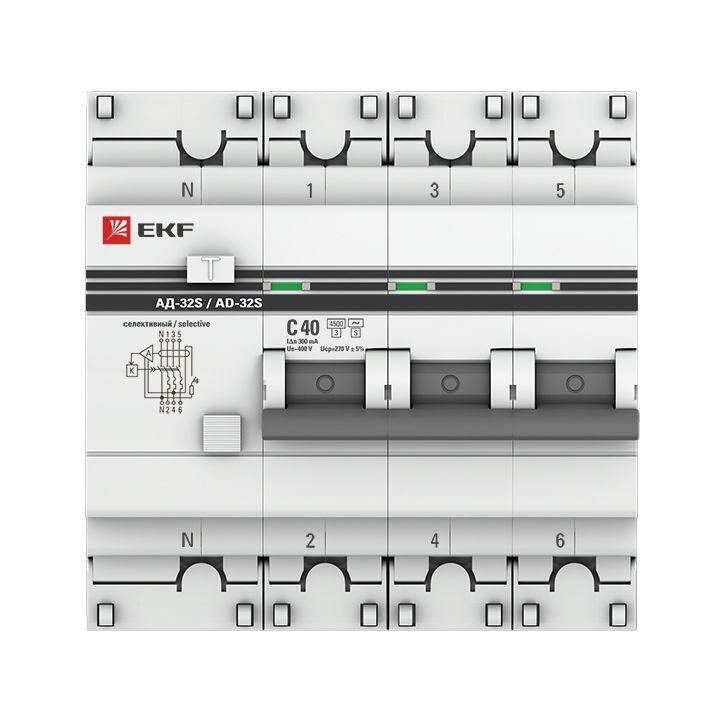Дифференциальный автоматический выключатель EKF PROxima АД-32, селективный, 3P+N, 32А, С, 300мА предназначен для защиты людей от поражения электрическим током при случайном прикосновении к открытым проводящим частям электроустановки, защиты электроустановки (ЭУ) при повреждении изоляции проводников и неисправностях ЭУ, предотвращения возгораний и пожаров, возникающих вследствие протекания токов утечки и развивающихся из них коротких замыканий, замыканий на корпус и замыканий на землю, автоматического отключения участка электрической сети при перегрузках и токах короткого замыкания. Применяется в электрических цепях переменного тока номинального напряжения 230В/400В и частотой 50 Гц бытового и промышленного назначения. АД 32S (селективный) специально предназначен для выдержки заранее установленного значения предельного времени неотключения, при протекании дифференциального тока.