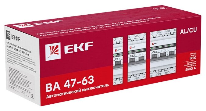 Автоматические выключатели ВА 47-63 4,5 кА EKF PROxima являются механическими коммутационными аппаратами, производятся в одно-, двух-, трех- и четырехполюсном исполнениях и соответствуют ГОСТ Р50345-2010. Особенностью данной серии выключателей является усовершенствованная конструкция. В выключателях имеются пластиковые крышки, закрывающие доступ к винтовому зажиму и служащие для опломбирования выключателей, что исключает несанкционированный доступ к проводникам. Корпус выключателей усилен дополнительными заклепками для устранения эффекта расхождения корпуса. Выключатели оборудованы удобной ручкой управления, обеспечивающей надежное оперирование изделиями. На лицевой панели выключателей имеется цветовой индикатор состояния. Конструкция установочного зажима обеспечивает свободную установку выключателя на DIN-рейку.