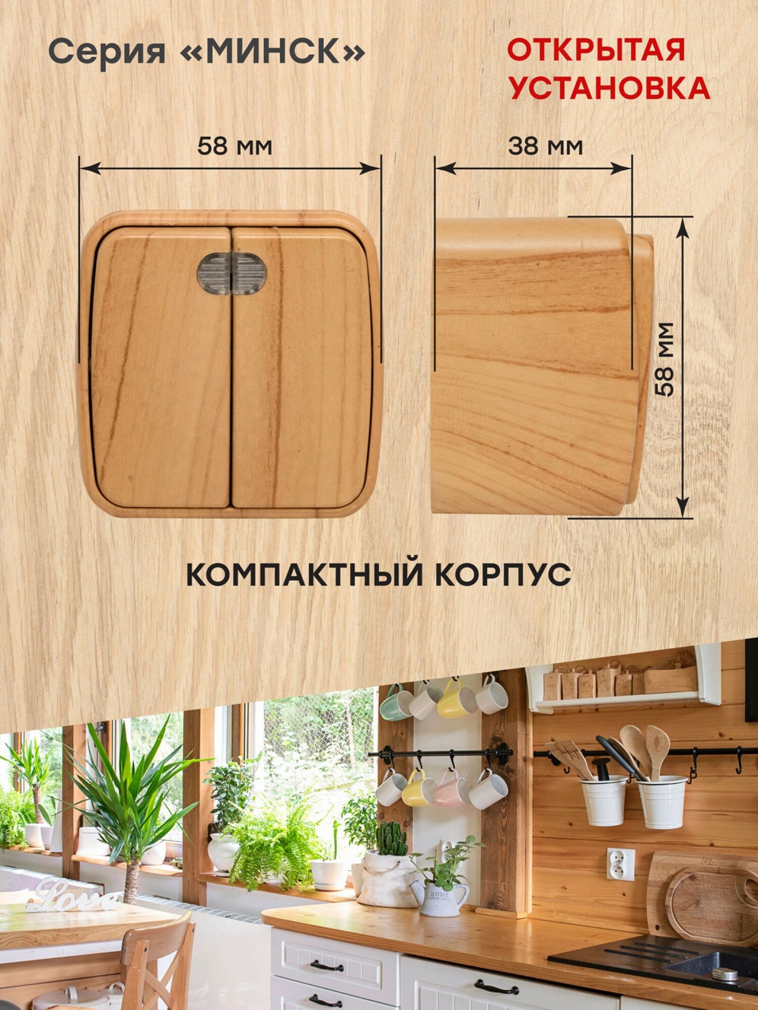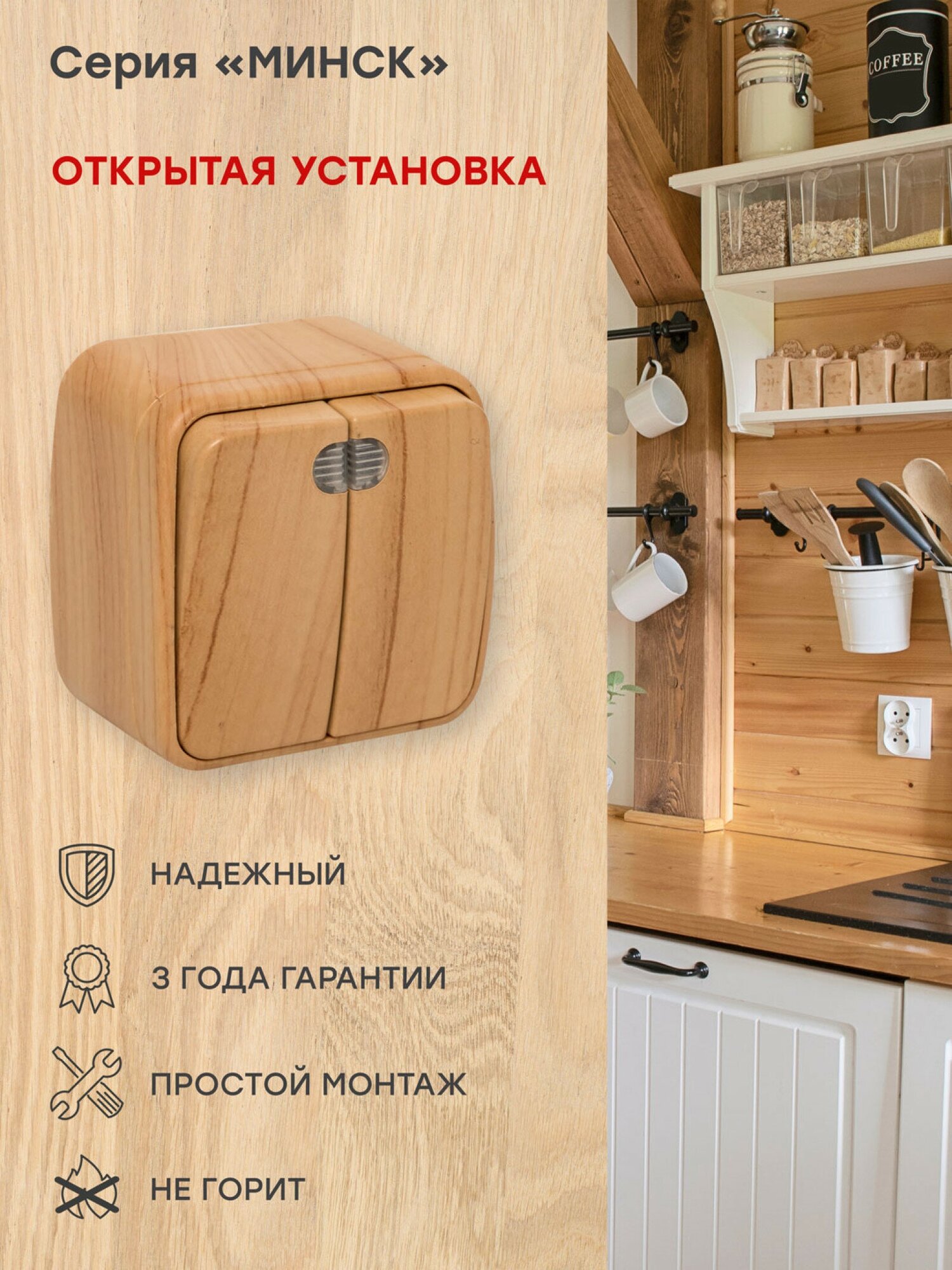 ОПИСАНИЕ. Дополнение к основной серии электроустановочных изделий для открытой проводки «Минск», компания EKF предлагает вашему вниманию изделия в цвете светлое и темное дерево. Данный продукт сочетает в себе все преимущества и качество основной линейки с дизайном «под дерево». Все изделия изготовлены методом окрашивания с дальнейшей фактурной текстуризацией, что великолепно передает рисунок натуральной древесины. Такое покрытие долговечнее и практичнее пленки, которую используют многие компании на рынке. Новинка сочетается с прочими изделиями EKF имеющими окраску «под дерево» и позволит Вам создать комплексное решение по электроснабжению Вашего загородного дома или дачи. Конструкция и материалы серии специально оптимизированы для надежной и долговечной службы изделий и быстрого и удобного монтажа. А литое основание из полностью негорючих материалов сделает использование в условиях деревянного дома максимально безопасным. ПРЕИМУЩЕСТВА. Пластичные пружины в контактной. Компактный корпус. Изделия в цвете темное и светлое дерево. Удобное подключение проводников. Выштамповки с 4 сторон для подвода кабеля. ПРИМЕНЕНИЕ. Управление и организация осветительной сети помещений. Подключение различных бытовых потребителей к электрической сети. Подключение коммуникационных устройств к различным информационным сетям. Коммерческая недвижимость. Объекты инфраструктуры. Жилые помещения.