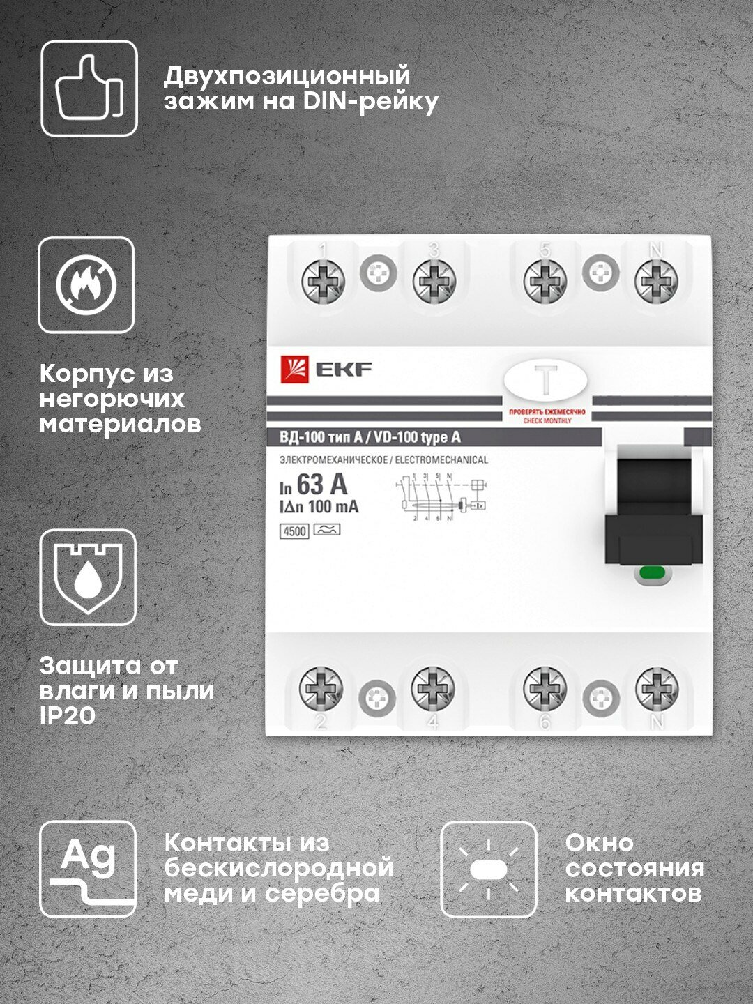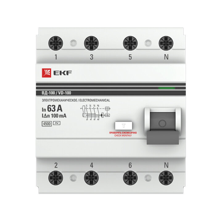 УЗО 4П 63А 100мА EKF PROxima ВД-100 (эл-мех, тип А)Устройство защитного отключения УЗО ВД-100 EKF PROxima – это новое поколение устройств. Предназначены для защиты человека от поражения электрическим током при прикосновении к открытой проводке или к электрооборудованию, оказавшемуся под напряжением и для предотвращения возгорания, возникающего вследствие длительного протекания токов утечки и развивающихся из них токов короткого замыкания. Для защиты потребителей от токов перегрузки и короткого замыкания необходимо использовать УЗО совместно с автоматическими выключателями.Возможность работы при - 25 °С.Наличие селективного исполнения.