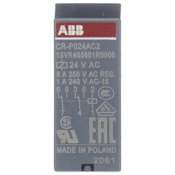 Реле CR-P024AC2 24B AC 2ПК (8А) ABB 1SVR405601R0000 1 Втычное интерфейсное реле управления для печатных плат CR-P024AC2 24B AC 2ПК (8А) ABB Интерфейсные реле широко используются в различных отраслях промышленности: Они служат интерфейсом между контроллерами (программируемый логический контроллер), PC или системами полевых шин и датчиками / выключателями. При этом реле выполняют следующие функции: переключение нагрузок переменного или постоянного тока с различными индуктивными и емкостными элементами и сопротивлениями, переключение напряжений от нескольких мВ до 250 В, переключение тока от нескольких мА до 16A, усиление слабых управляющих сигналов, гальваническая развязка цепи управления и нагрузки, усиление сигналов. В отличие от электронных устройств коммутации в интерфейсных реле не используются дополнительные внутренние защитные цепи. Реле снабжены внутренней защитой от перегрузок, предохраняющей от кратковременных скачков тока и напряжения. Преимущества 9 Вариантов катушек для различного напряжения: DC версии - 12В,24В,48В,110В AC версии - 24В,48В,110В,120В,230В Выходные контакты: 1п.к.(16А) 2п.к.(8А) Логические или стандартные розетки Материал контактов не содержит кадмий Ширина по розетке: 15,5мм Втычные функциональные модули: Защита от несоблюдения полярности и ограничительные диоды Светодиод RC элемент Защита от перенапряжения Модули времени