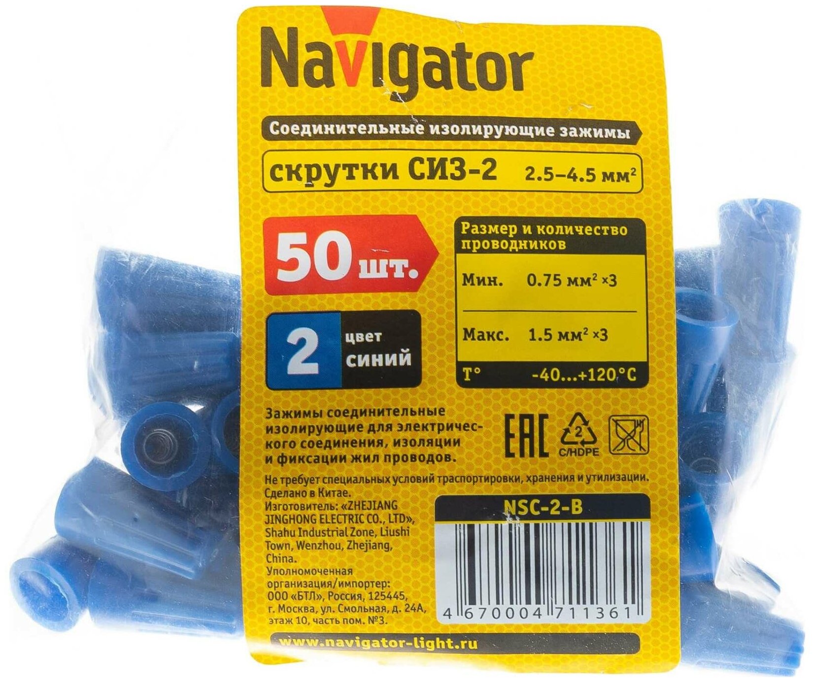 Соединитель проводов СИЗ-2 2.5-4.5 син. NSC-2-B (уп.50шт) Navigator 71136. Соединитель проводов СИЗ-2 1.5-3.5 син.NSC-2-B (уп.50шт) Navigator 4670004711361 предназначается для качественного соединение проводов. Используется это изделия зачастую в бытовых условиях. Это устройство характеризуется прочностью, упрощенными условиями эксплуатации, надежностью и высоким качеством. Особенности • С помощью данного изделия можно соединять проводники, сечение которых составляет от 5 до 12 квадратных миллиметров, что значительно расширяет возможности пользователя. • Данное изделие можно использовать достаточно длительное время, так как оно производится согласно с мировыми стандартами качества и нормативными документами изготовления. • Производство этого приспособления осуществляется из полиамида, что обеспечивает ему коррозийностойкость, а также устойчивость к разнообразным воздействиям окружающей среды негативного характера. • С помощью эргономичной конструкции и данного изделия оно используется для обеспечения полноценной электрических систем. • Благодаря использованию универсального материала изготовления, данное изделие способно выполнять свои функции при температуре от -40 до +120 градусов. • Относительно небольшие габариты данного позволяют использовать его в любом удобном для пользователя месте (даже в самых недоступных местах).