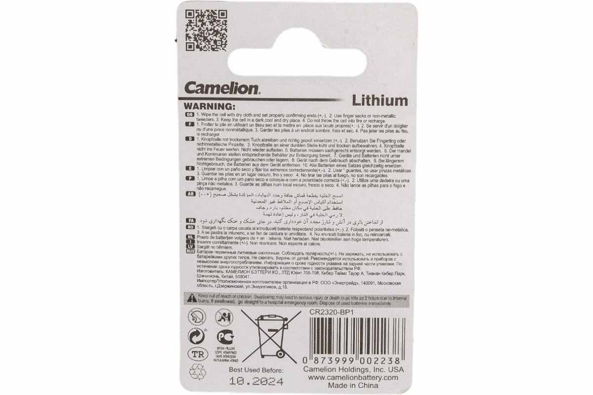 Батарейка Camelion CR2320 BL1 Lithium 3V (1/10/1800).Литиевый элемент питания CR2320.Литиевые элементы питания обладают более высоким напряжением, чем источники тока других электрохимических систем. Напряжение дисковых литиевых элементов составляет 3В.Имеют низкий уровень саморазряда (не более 2% в год) и длительный срок хранения (5 - 10 лет). Характеризуются стабильной работой в широком диапазоне температур (от -30 до +65°С).