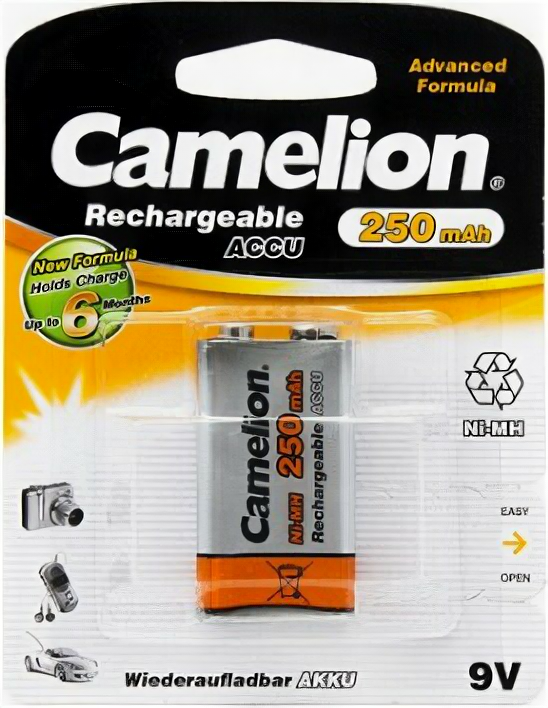 Аккумулятор Camelion 9V-250mAh Ni-Mh , 5014 подойдет для цифровой техники, радиоуправляемых игрушек, фото- и видеокамер, телефонов и различной цифровой техники. Прост и удобен в использовании, не требует много времени на подзарядку (отсутствует "эффект памяти"). Безопасен для окружающей среды. Элемент оснащен индивидуальной упаковкой, которая защищает его от попадания пыли, грязи и влаги. Для приборов и устройств ежедневного использования Ni-Mh аккумуляторы Camelion являются надежным и экономичным источником тока. В настоящее время Ni-Mh аккумуляторы очень популярны, используются повсеместно: в фонарях, детских игрушках, пультах, радиотелефонах, компьютерных мышках, триммерах - в любых устройствах с любым энергопотреблением. Аккумуляторы Camelion безопасны и удобны в использовании. Не обладают эффектом памяти. Их, в отличие от кадмиевых аккумуляторов, можно заряжать при любом остаточном уровне заряда. Допустимо использование при отрицательных температурах: до -20°C. Однако, нужно сразу сказать, что при низких температурах продолжительность работы NiMh АКБ крайне мала. Оптимальный температурный режим работы металлогидридных аккумуляторов находится в пределе от -10 до 40°C. Срок использования - до 1000 циклов “заряд-разряд”. При хранении Ni-Mh аккумуляторов не допускайте их глубокого разряда. Желательно, чтобы напряжение на них было выше 1В. При падении напряжения ниже 0.9В аккумуляторы Camelion могут утратить способность заряжаться.
