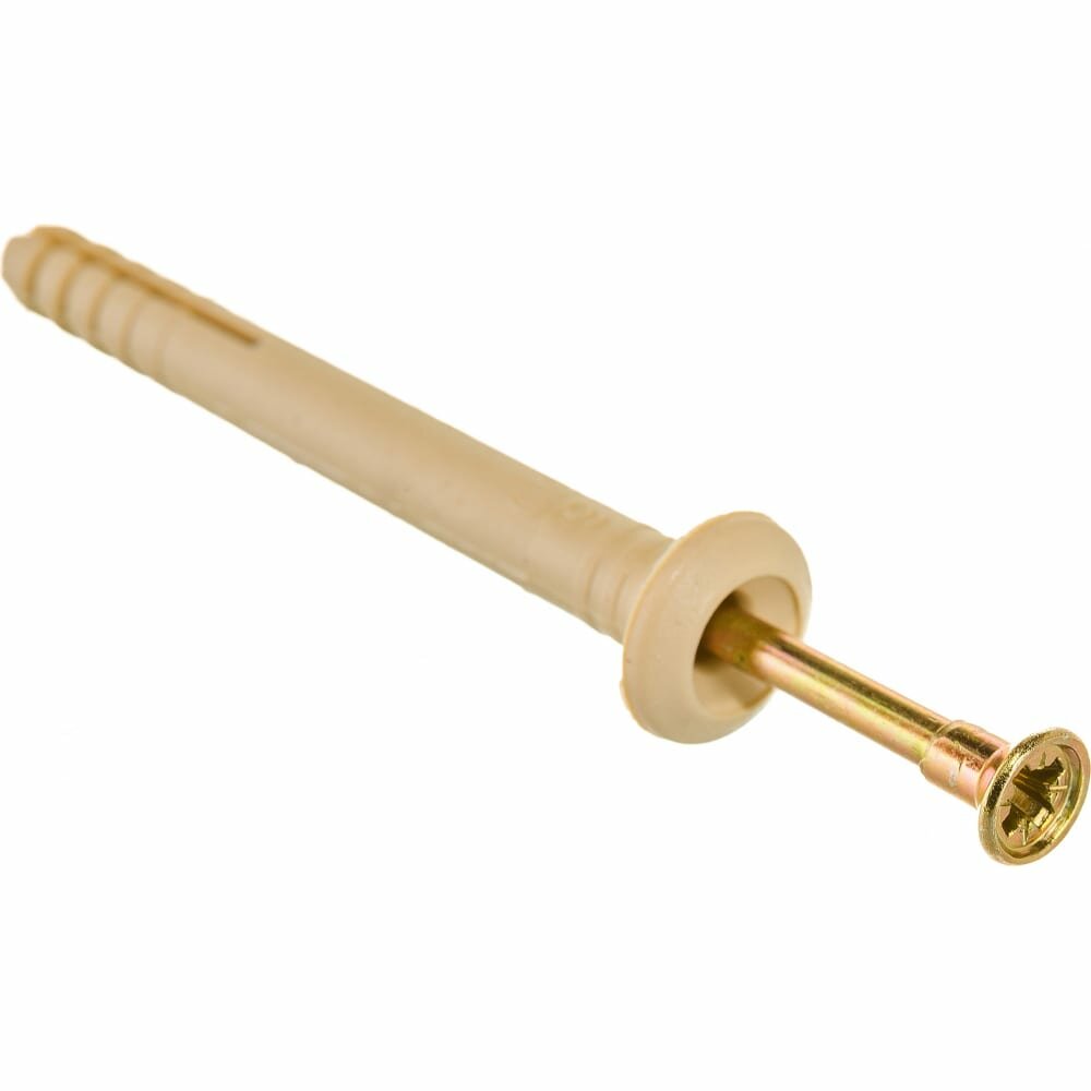 Нейлоновый распорный дюбель со стальным оцинкованным гвоздем-шурупом желтого цвета с увеличенным подголовником. Предназначен для быстрого монтажа различных конструкций к плотным материалам. Грибовидный бортик дюбеля позволяет скрыть неровности и сколы стенок отверстия, а также исключает соприкосновение поверхностей крепежа и прикрепляемого предмета во избежании окисления. Усиленный подголовник у основания шляпки выдерживает значительные нагрузки при забивании и плотно фиксируется в отверстии дюбеля, предохраняя его от излома. Нейлон обладает высокими техническими характеристиками и ресурсом (сроком службы).