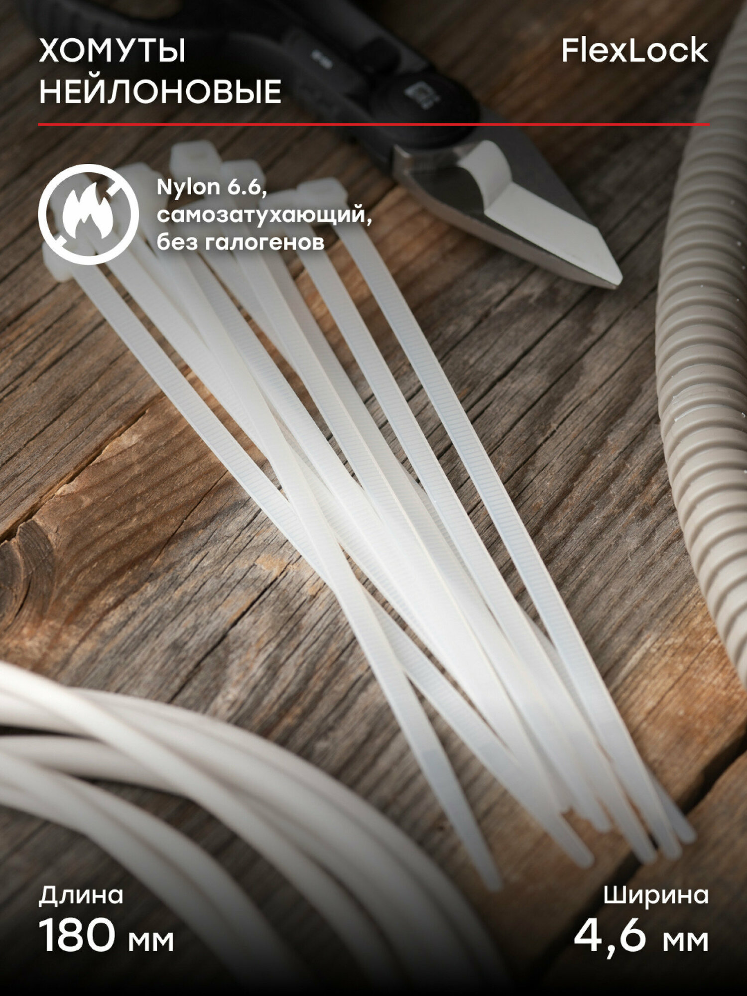 Хомуты серии FlexLock предназначены для увязки кабелей и проводов в пучок и монтажа кабельных линий и проводников. Изготовлены из полиамида 6.6, который обладает хорошей устойчивостью к маслам, смазкам, масляным производным, хлоридным растворителям, устойчивостью к слабым кислотам и УФ-лучам. Кабельные стяжки серии FlexLock имеют самофиксирующийся ремешок с блокирующим механизмом. При производстве кабельных стяжек черного цвета добавляется угольный порошок, который является одним из наиболее эффективных стабилизаторов. Он улучшает физические свойства продукции в стойкости к погодным условиям и УФ-излучению (прямые солнечные лучи). Наборы хомутов в банках представляют собой кабельные стяжки наиболее распространенных габаритов и разных цветов собранных в одной пластиковой упаковке. Благодаря прозрачной пластиковой упаковке такие наборы легко транспортировать и легко идентифицировать какой цвет и габарит хомута находится в упаковке. Разные цвета очень удобны в применении в быту и для маркировки.
