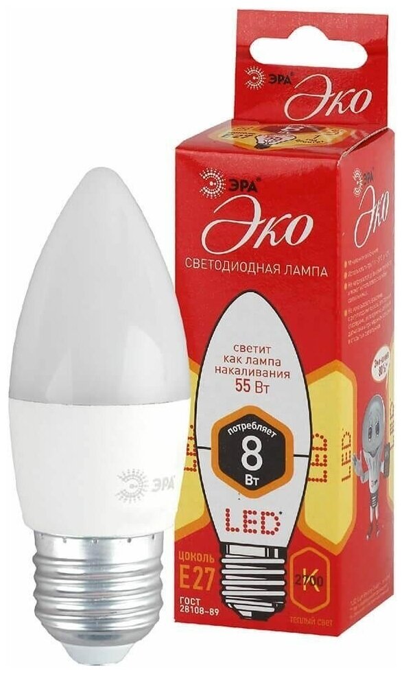 Б0030020 Лампа светодиодная LED B35-8W-827-E27(диодсвеча8ВттеплE27) Эра ECO LED B35-8W-827-E27