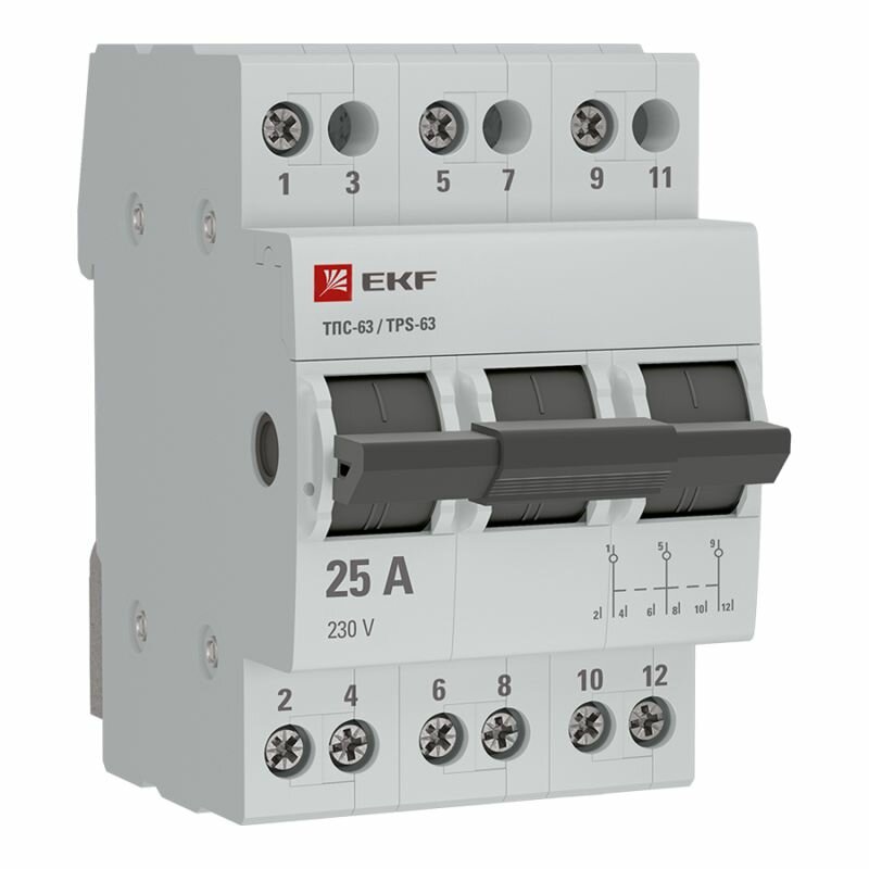 **Трехпозиционный переключатель EKF Proxima** — это механический аппарат для переключения питающей линии или нагрузки, редкого быстрого выключения электроцепи и проведения тока в нормальном режиме. Он соответствует ГОСТ IEC 60947-3. Ширина переключателя составляет 54 см, глубина — 72 см, высота — 83 см, вес равен 0,056 кг. Его номинальный ток — 25 А, а рабочее напряжение — 400В, поэтому он подходит для трехкомнатных квартир с большим количеством приборов. Она оснащен 3 полюсами, которые срабатывают одновременно. На каждую клемму подключают 1 фазу. Отключающая способность 10 кА дает возможность использовать аппарат в бытовых и промышленных условиях. Устанавливается прибор на DIN-рейку. Корпус выполнен из пластика, который отличается прочностью и не поддерживает горение. Переключатель изготовлен в Китае. На него дается гарантия на 7 лет.