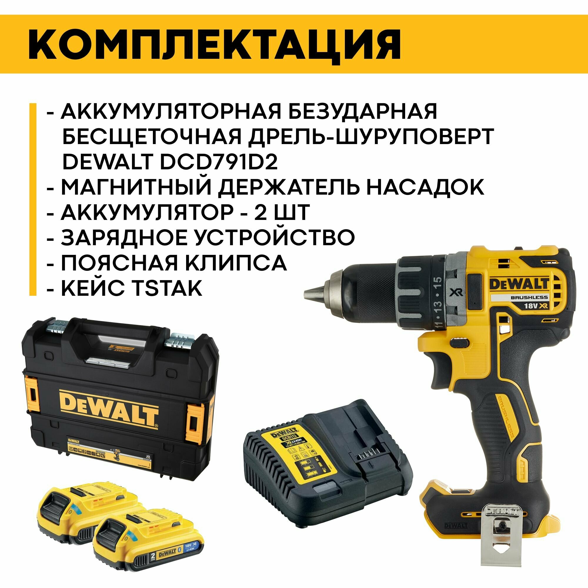 Модель: DCD791D2-QW 18 В XR бесщеточная 460 Вт, 2 скорости