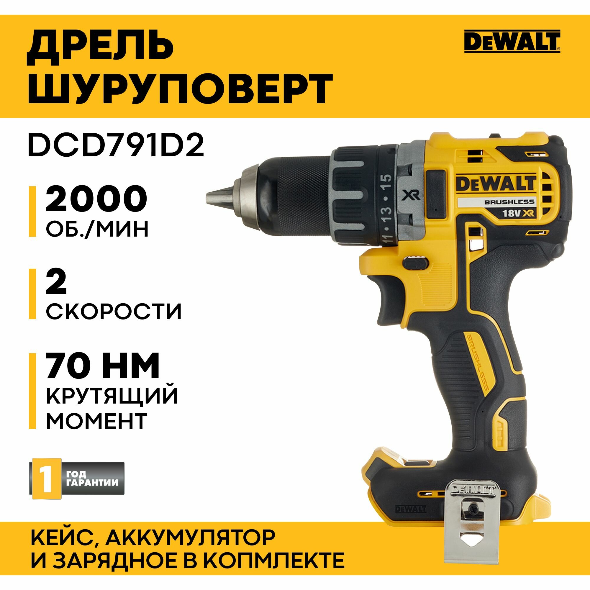 DCD791D2-QW Дрель-шуруповерт (Li-Ion 18 В 2.0 Ач 550/2000 об/мин 70/27 Нм) DeWALT DCD791D2-QW 18 В XR бесщеточная 460 Вт, 2 скорости