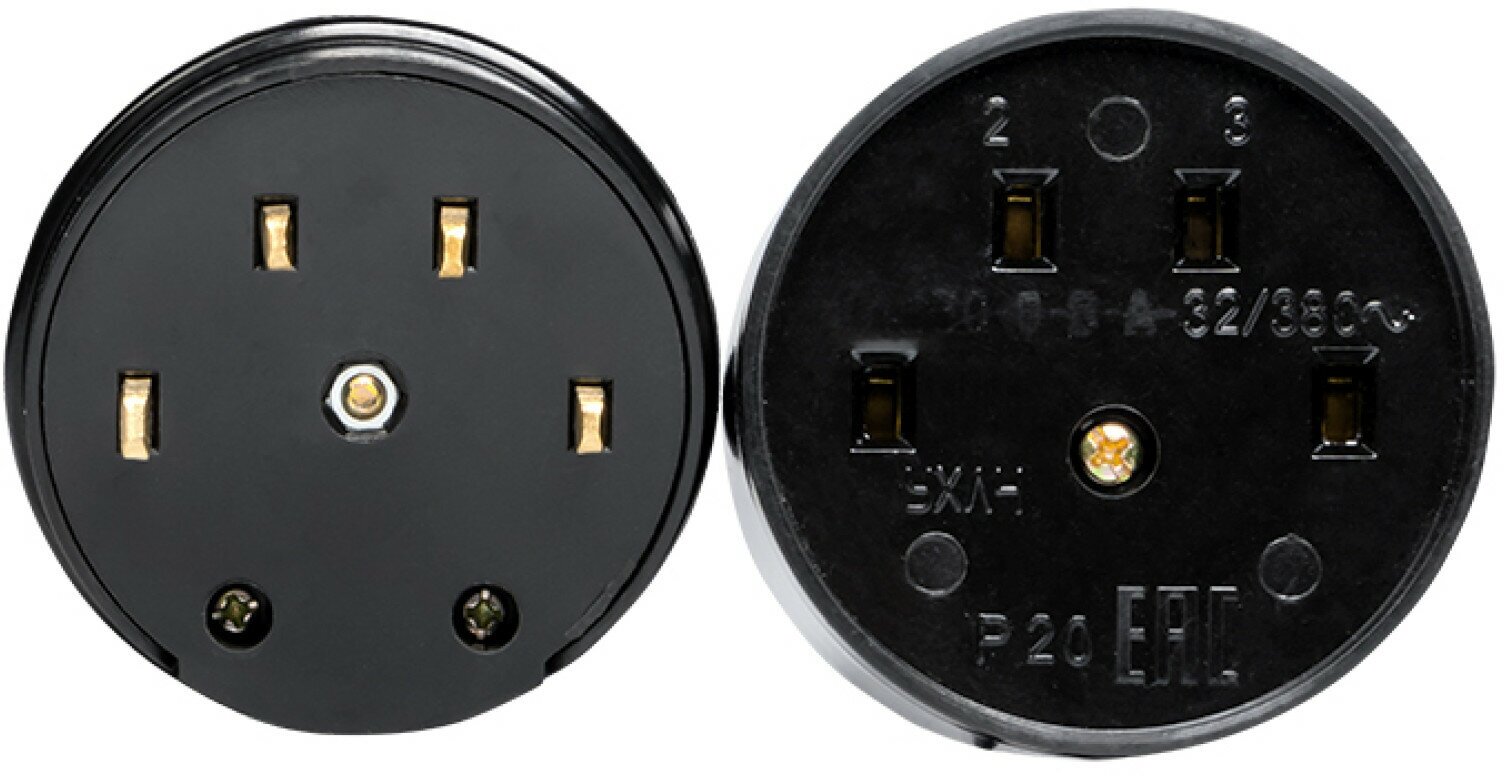 ОПИСАНИЕ. Разъемы предназначены для подсоединения электротехнических устройств мощностью до 7 кВт (32 А) к трехфазной и однофазной сети переменного тока напряжением 400 / 230 В с частотой 50 Гц. Обычно их используют для подключения электрических плит, варочных панелей и духовых шкафов. ПРЕИМУЩЕСТВА. Дополнительная прижимная скоба для прочной фиксации кабеля внутри изделия. Гроверная шайба под винтом контакта для предотвращения ослабления контактов. Выштамповки с двух сторон изделия для подведения кабеля. Изделия под два способа установки – скрытой и открытой. Рифленый корпус позволяет надежно удерживать изделие при разъединении. Медная контактная группа. ПРИМЕНЕНИЕ. Подключение электрических плит, варочных панелей, а также прочих бытовых приборов высокой мощности к электрической сети. Объекты инфраструктуры. Коммерческая недвижимость. Жилые помещения.