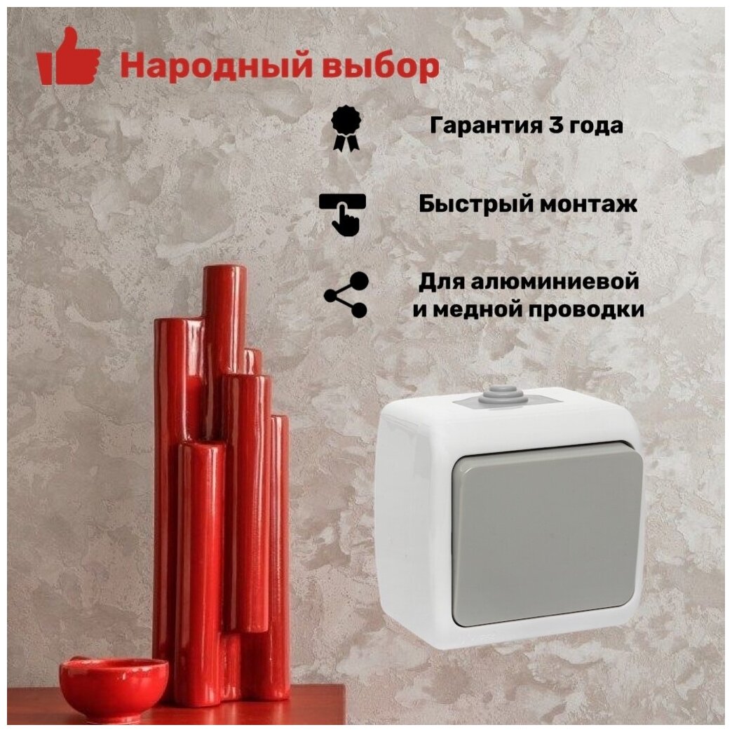 Выключатель 1-клавишный серии Мурманск - это решение для открытой проводки которое позволяет организовать электроснабжение в условиях высокой влажности, пыльных помещениях, подсобках, гаражах, на улице при условии установки под навесом. Мурманск имеет ряд конструктивных решений для удобства и безопасности использования, быстрого монтажа. Корпус выключателей не потемнеет и не потеряет своей прочности при установке на улице.