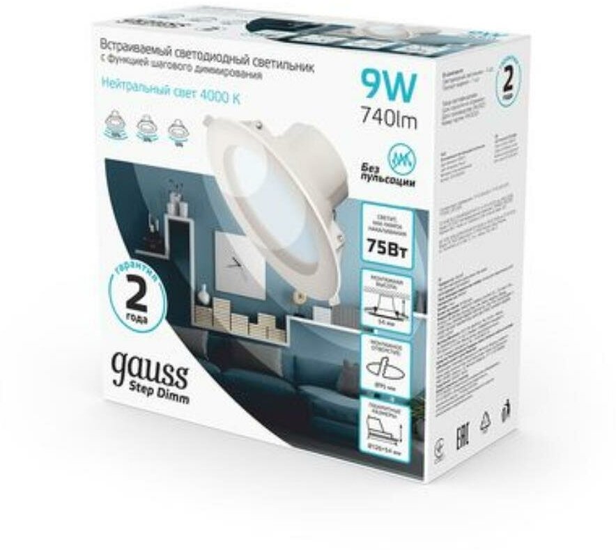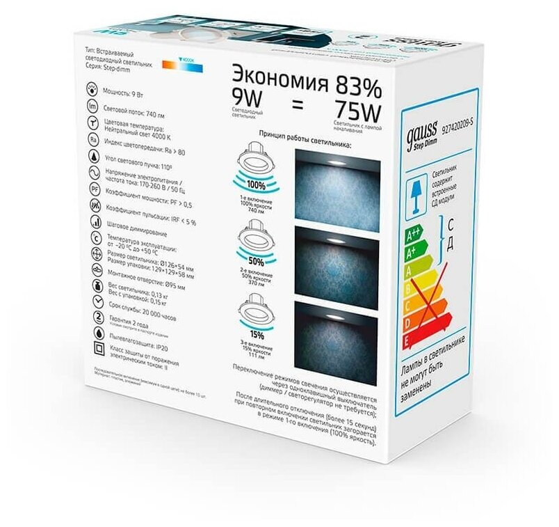 Встраиваемый светильник 927420209-S - продукт известной компании Gauss (Россия). Имеет максимальную мощность 9 Вт, освещает площадь до 1.8 кв. м. Отлично подойдет для таких мест, как гостиная, прихожая и коридор, спальня, кухня. Впишется в интерьеры следующих стилей: хай-тек.