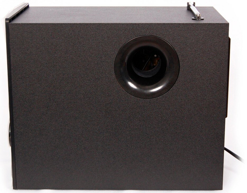 Сабвуфер типа фазоинвертор, с выходом на боковую панель, выполнен из МДФ. На передней панели - регулятор громкости и несколько входных интерфейсов для подключения различных носителей информации (USB- и SD), 3,5-мм разъемы и 2RCA, слот для карт SD, а также настройки для встроенного FM-радио.