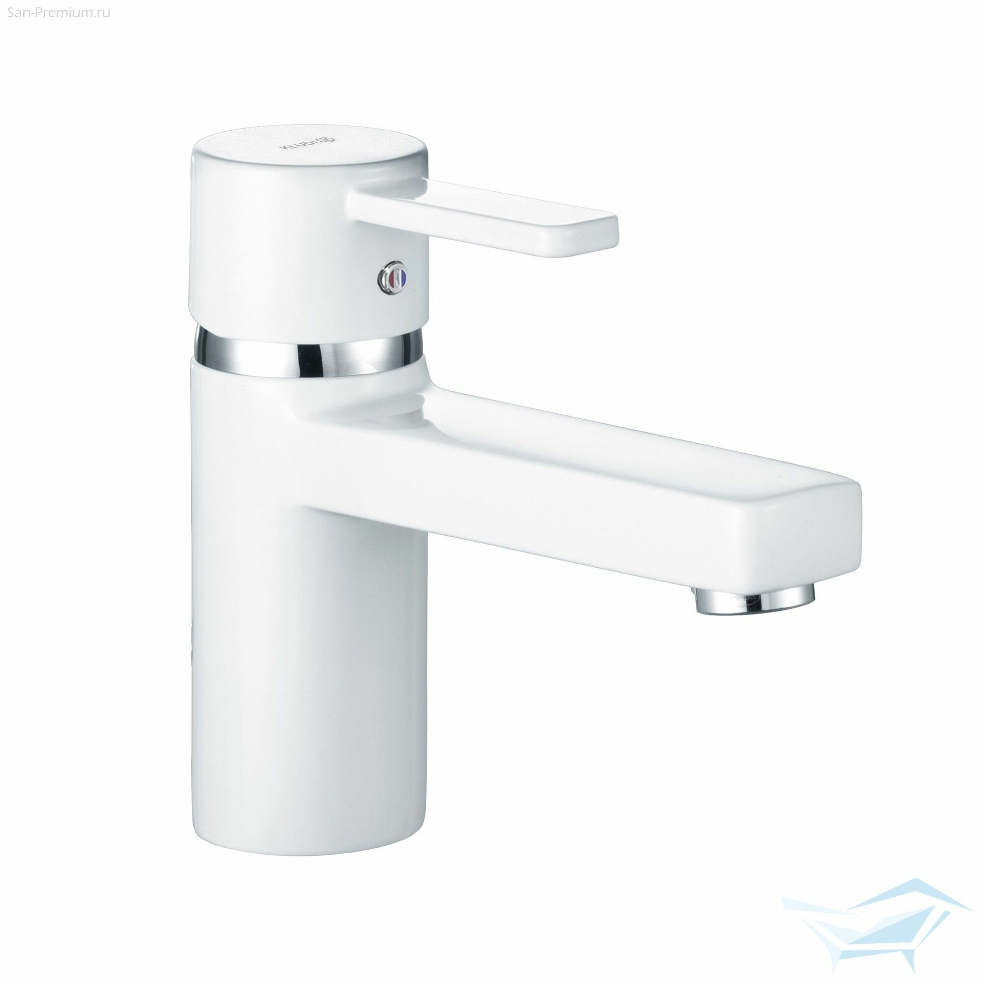 Смеситель изготовлен из материала-латунь, покрытие белый/хром. Способ монтажа горизонтальный. Гибкая подводка.
