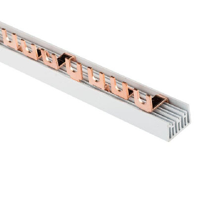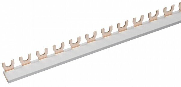 ОПИСАНИЕ. Шины соединительные представляют собой пластины, выполненные из меди (шины на 100 А – из луженой меди), закрепленные в корпусе из диэлектрического материала, не поддерживающего горение, и выпускаются стандартной длиной 1 метр. Шины соединительные делятся на два типа - FORK («вилка») и PIN («гребенка») на номинальные токи 63 и 100 А. Могут быть выполнены в одно- двух- трех- и четырехполюсном исполнений. ПРЕИМУЩЕСТВА. Шины поставляются в комплекте с заглушками. Зажим для подключения автомата и шины тип PIN. Шины на 100 А выполнены с нанесением лужения для одновременного подключения с алюминиевыми проводниками. Вся необходимая информация нанесена на корпус изделия термопечатью. Шина изготовлена из электротехнической меди марки М1. ПРИМЕНЕНИЕ. • Шины с шагом 18 мм используются для коммутации большинства модульного оборудования шириной, кратному 1 модулю; • Шины с шагом 27 мм используются с модульным оборудованием шириной кратному 1,5 модуля (автоматические выключатели ВА 47?100, ВА 47?125); • Шины соединительные 12 модулей широко используются в квартирных щитах благодаря компактному размеру; • Шины соединительные для диф. автоматов удобны в применении благодаря специальному расположению отводов шины.