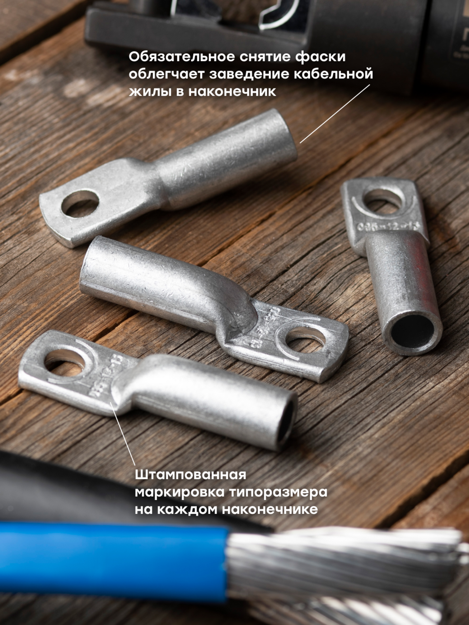 Силовые наконечники и гильзы используются для оконцевания проводов и кабелей с медными и алюминиевыми жилами посредством опрессовки для последующего болтового соединения проводника с оборудованием или шиной. Для оконцевания проводников необходимо использовать специальный обжимной инструмент.