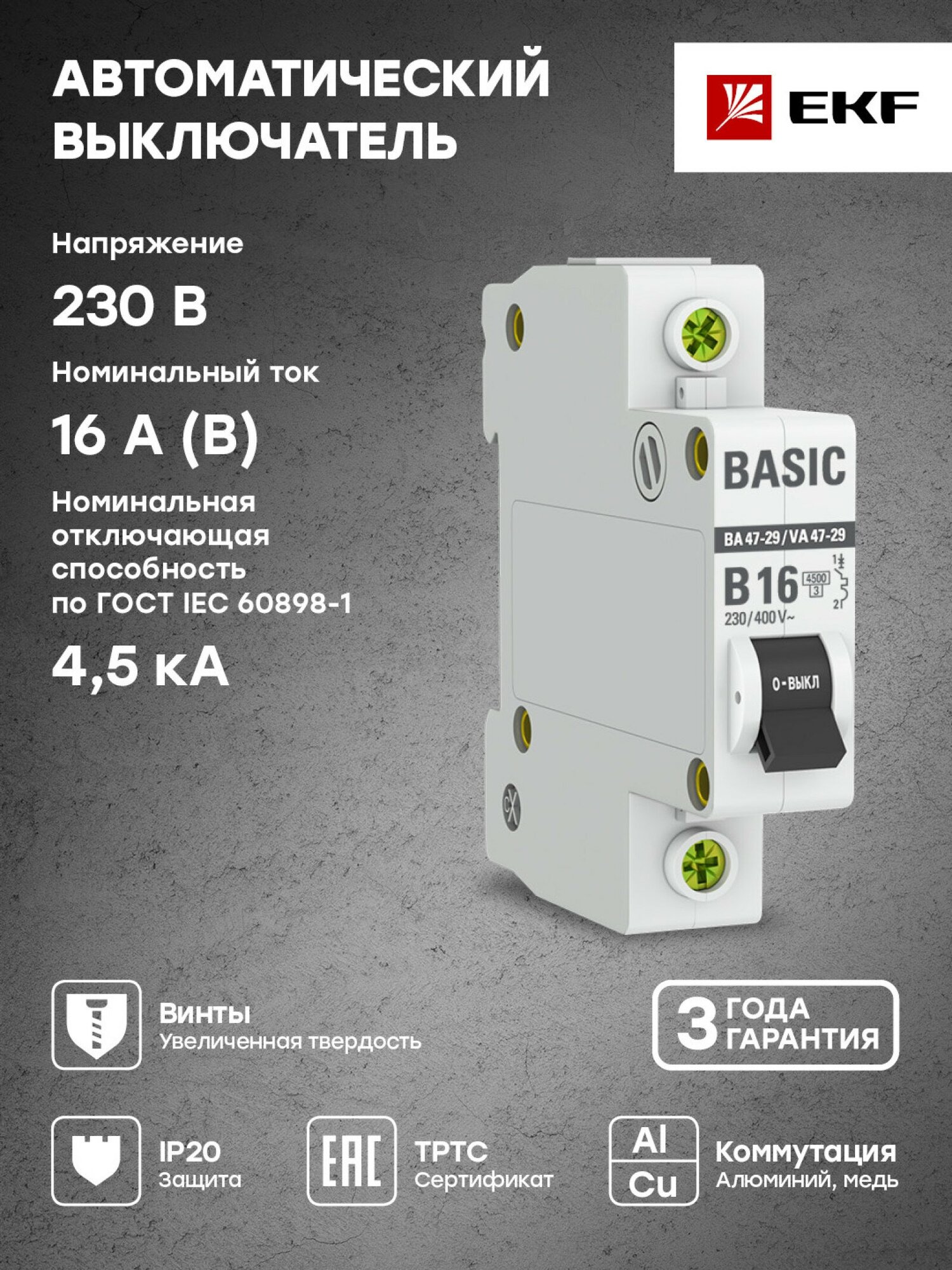Автоматические выключатели ВА 47-29 4,5 кА EKF Basic разработаны для того, чтобы обеспечить комплектацию объектов надежным электрооборудованием по доступной цене. Производятся в одно-, двух-, трех- и четырехполюсном исполнении. ОПИСАНИЕ. 1. Времятоковая характеристика срабатывания – диапазон срабатывания электромагнитной защиты. С – выключатель сработает между 5- и 10-кратным значением номинального тока. Рекомендуется к установке в сетях со смешанной нагрузкой, предполагающей умеренные пусковые токи (гражданское строительство, офисные помещения). 2. Номинальный ток – базовое значение тока, в сравнении с которым происходят защитные действия автоматического выключателя по превышению тока нагрузки. 3. Класс токоограничения – расцепление происходит за 1/3 полупериода (2,5-6 мс). 4. Предельная коммутационная способность (ПКС) – это максимально возможный ток короткого замыкания, при возникновении которого автоматический выключатель сможет отключить защищаемую им цепь и остаться при этом работоспособным. ПРЕИМУЩЕСТВА. Надежный и проверенный конструктив. Широкий ассортимент. Экономия бюджета 10–50% по сравнению с европейскими брендами. ПРИМЕНЕНИЕ. Автоматические выключатели ВА 47-29 EKF Basic применяются в административных, промышленных и жилых сооружениях: проведение тока в нормальном режиме; оперативное управление участками электрических цепей; защита от токов перегрузки и короткого замыкания; используются в качестве основного элемента системы конечного распределения.