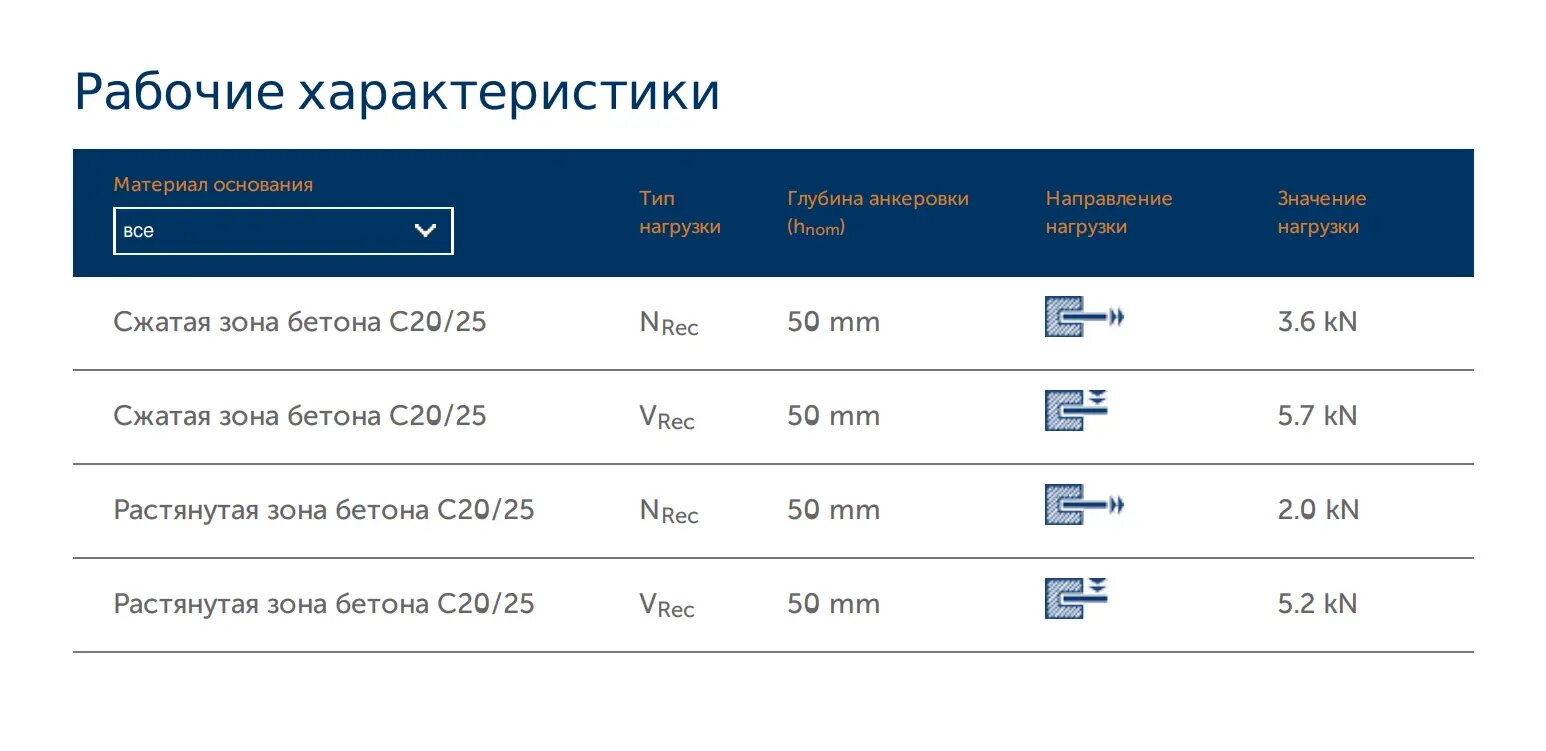 | Усилие на срез (растянутая зона бетона C20/25) | 5.2кН |