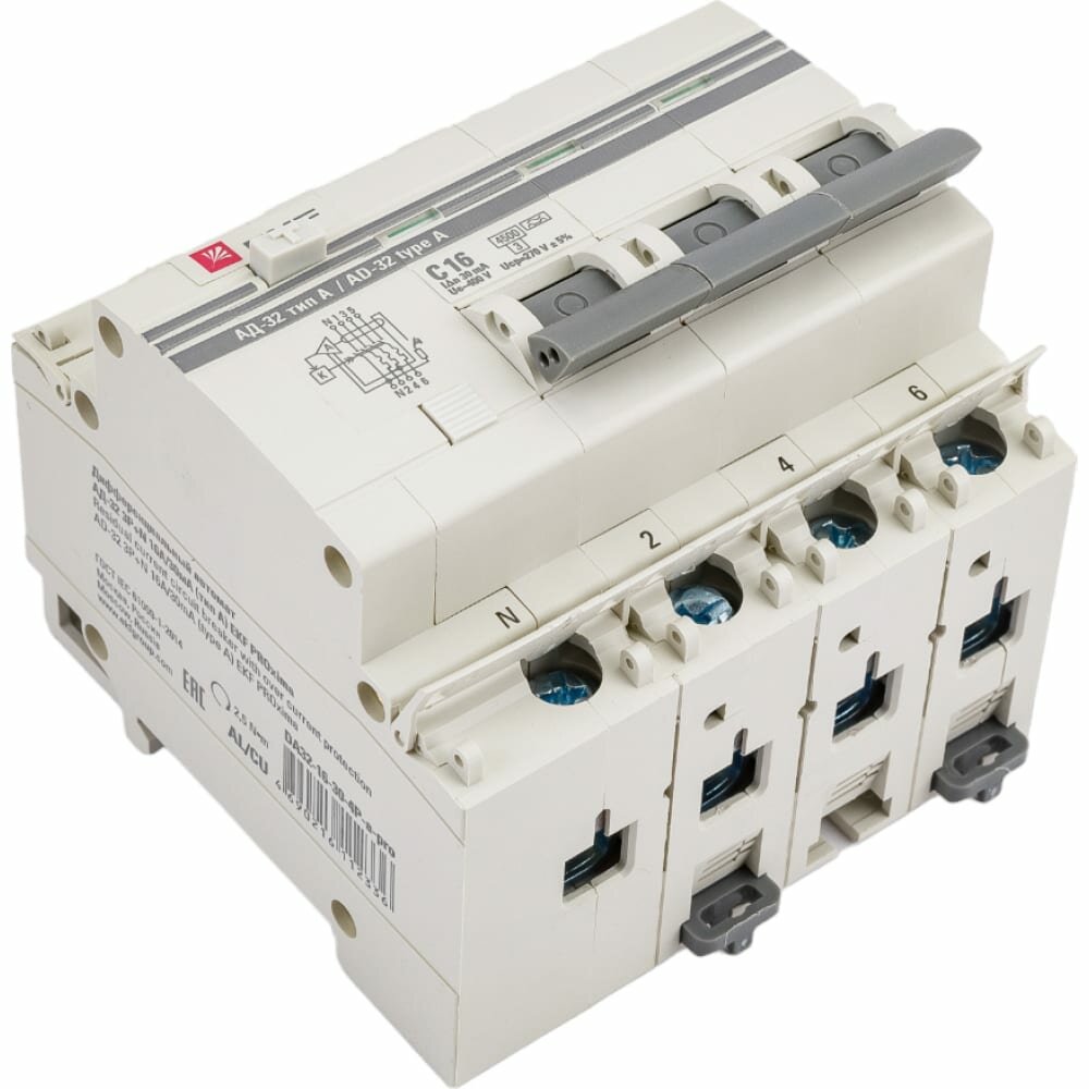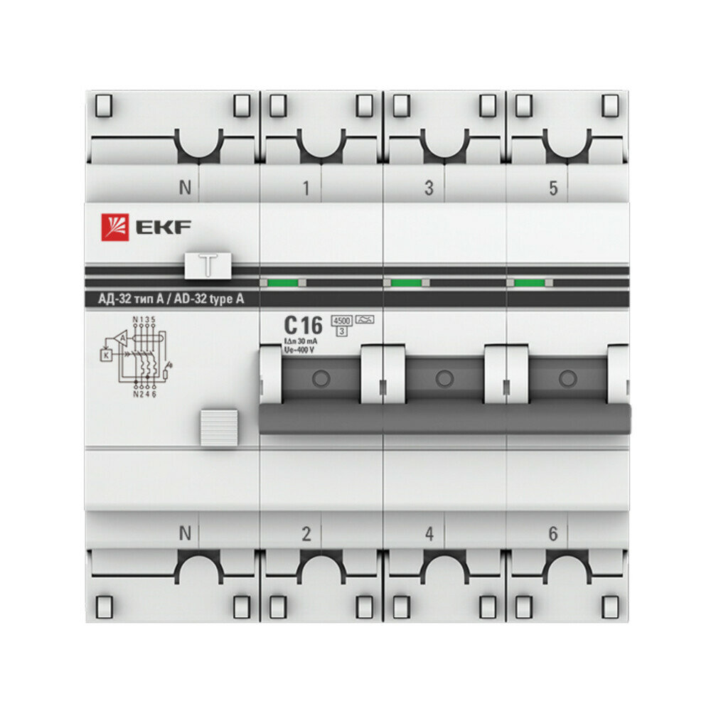Дифференциальный автоматический выключатель EKF PROxima АД-32, 3P+N, 63А, С, 30мА, тип А предназначен для защиты людей от поражения электрическим током при случайном прикосновении к открытым проводящим частям электроустановки, защиты электроустановки (ЭУ) при повреждении изоляции проводников и неисправностях ЭУ, предотвращения возгораний и пожаров, возникающих вследствие протекания токов утечки и развивающихся из них коротких замыканий, замыканий на корпус и замыканий на землю, автоматического отключения участка электрической сети при перегрузках и токах короткого замыкания. Применяется в электрических цепях переменного тока номинального напряжения 230В/400В и частотой 50 Гц бытового и промышленного назначения. АД 32 (тип А) - АВДТ, срабатывание которого происходит как от синусоидального переменного, так и пульсирующего постоянного дифференциального тока (как при медленном возрастании, так и при внезапном появлении).