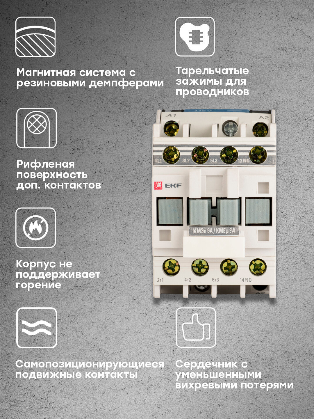 ОПИСАНИЕ. Контакторы КМЭп Proxima состоят из корпуса, закрепленных в нем неподвижных контактов, подвижных контактов, которые закреплены в подвижной части магнитной системы. Неподвижная часть магнитной системы закреплена жестко в корпусе КМЭп. Пружина препятствует смыканию контактов. При подаче напряжения на катушку управления в магнитной системе контактора возникает магнитное поле, которое, преодолевая сопротивление пружины, смыкает магнитную систему и замыкает контакты. При отключении напряжения с катушки управления пружина размыкает контакты. Возможна коммутация алюминиевым и медным проводником. ПРЕИМУЩЕСТВА. Корпус и подвижная траверса выполнены из термостойкой пластмассы. Маркировочная площадка в комплекте для идентификации контакторов в щите. Мостиковый контакт создает условия для быстрого гашения дуги. Рифленая поверхность доп. контактов для присоединения с целью увеличения токопроводности и надежности соединения. Сердечник магнитной системы с уменьшенными вихревыми потерями. Возможность установки как на DIN-рейку, так и на монтажную панель. Магнитная система оснащена резиновыми демпферами, что уменьшает шум при работе. Тарельчатые зажимы для надежного присоединения проводников. Высокая коммутационная износостойкость Серебросодержащий композит на контактах обеспечивает низкое переходное сопротивление и высокую сопротивляемость разрушению при коммутации. Наличие дополнительных контактов для организации автоматизации. Самопозиционирующиеся подвижные контакты. Они могут качаться, подпружинены и имеют сферическую поверхность. Сердечник выполнен из высококачественной электротехнической стали, что позволяет катушке надежно удерживать контакты во включенном состоянии при нормальном напряжении катушки управления. ПРИМЕНЕНИЕ. Включение/отключение технологических машин и оборудования, в том числе высокодискретных автоматических линий, решения для управления и автоматизации. Включение/отключение освещения: производственного, уличного, офисного, коммерческих объектов. Коммутация различных механизмов в сфере ЖКХ, коммерческой недвижимости и производственных помещениях (насосные станции, станции управления электродвигателями, вентиляция, автоматические ворота и двери). Производство оборудования массового пользования: тепловые пушки, обогреватели, модульные кондиционеры, электрооборудование для сада и дачи.