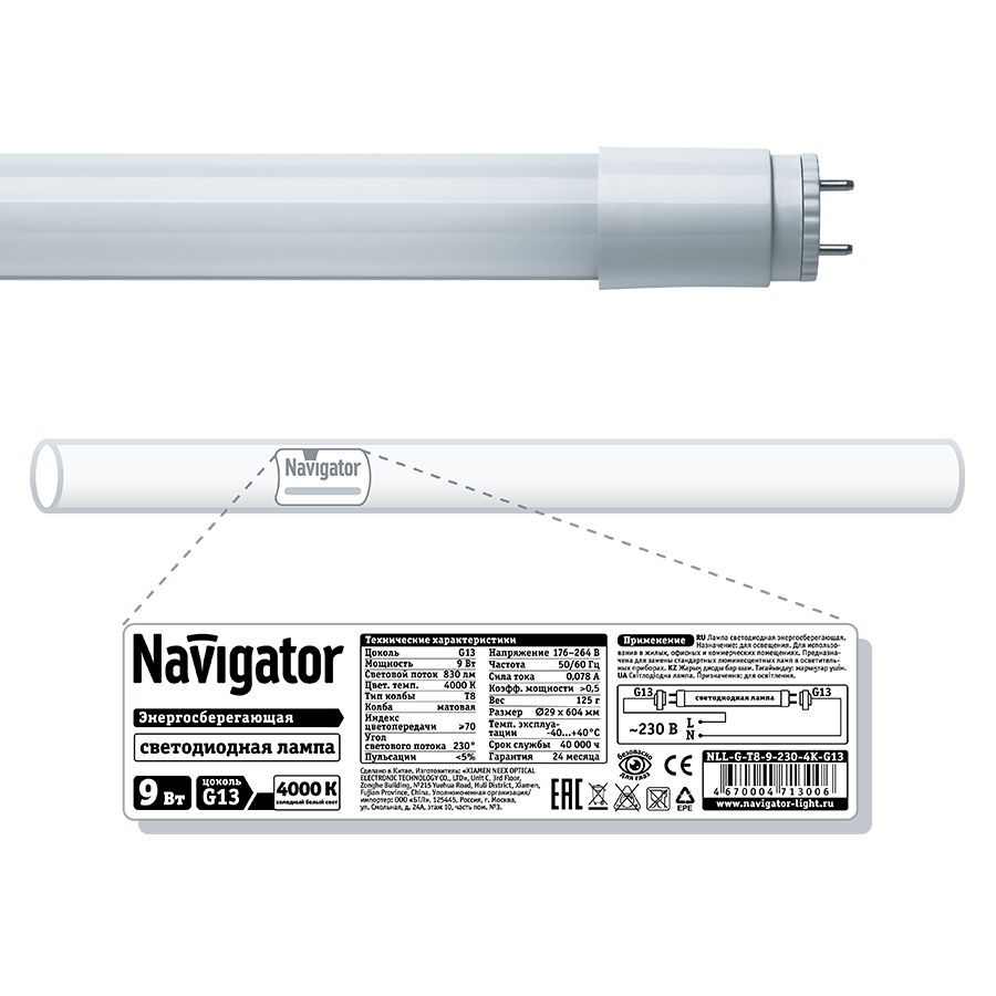 71301 NLL-G-T8- 9-230-6.5K-G13(аналог 18Вт. 600 мм) светодиодная лампа Navigator 71 301 NLL-G-T8-9-230-6.5K-G13