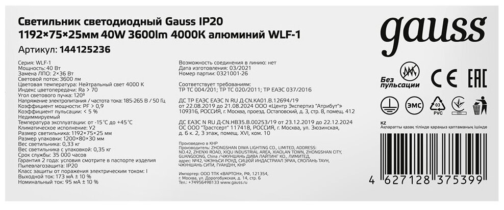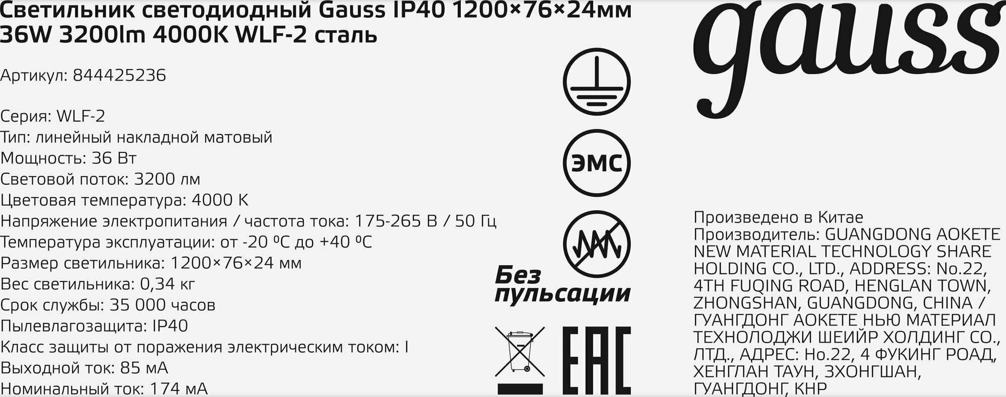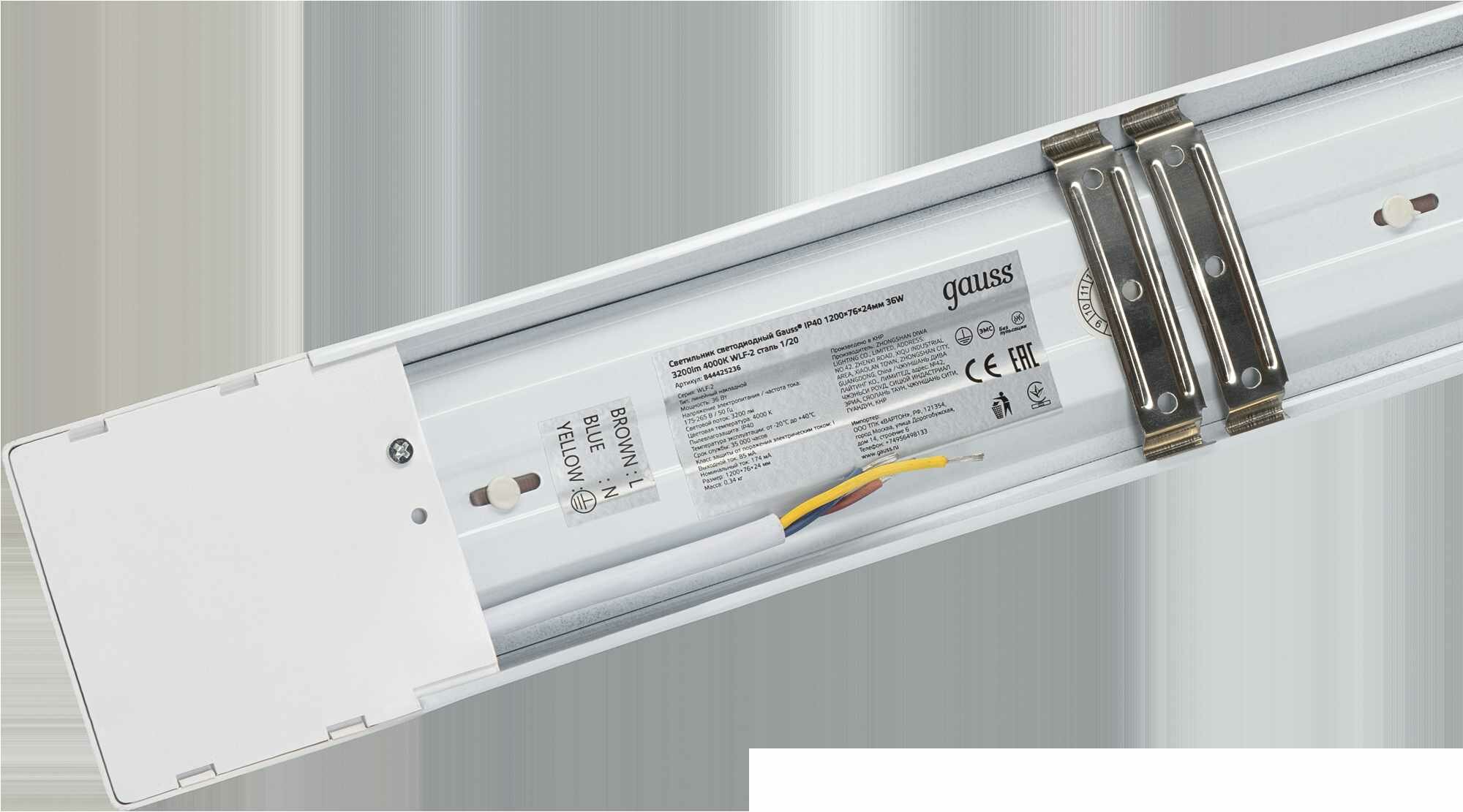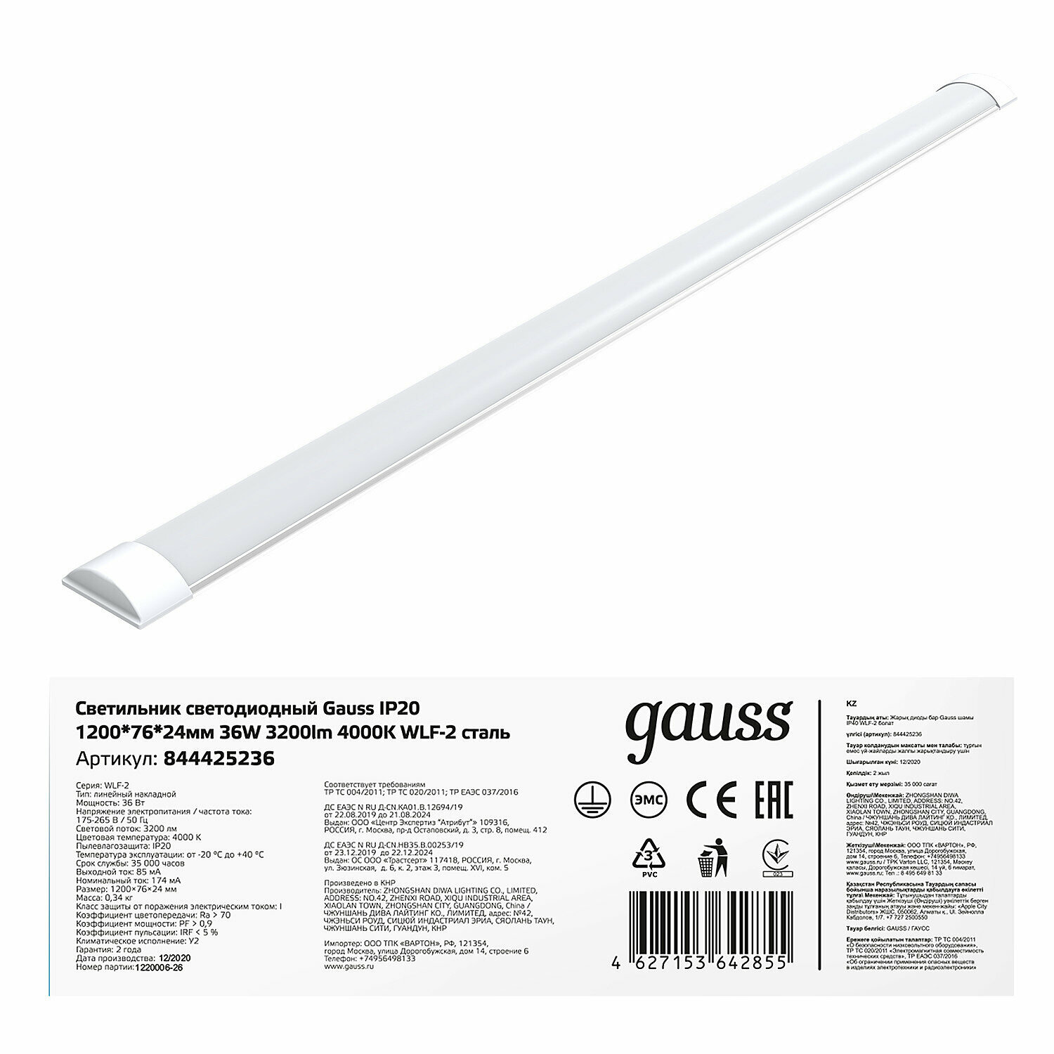 844425236 Светильник светодиодный IP20 1195*74*24мм 36W 2250lm 4000K cталь 1/20 Gauss