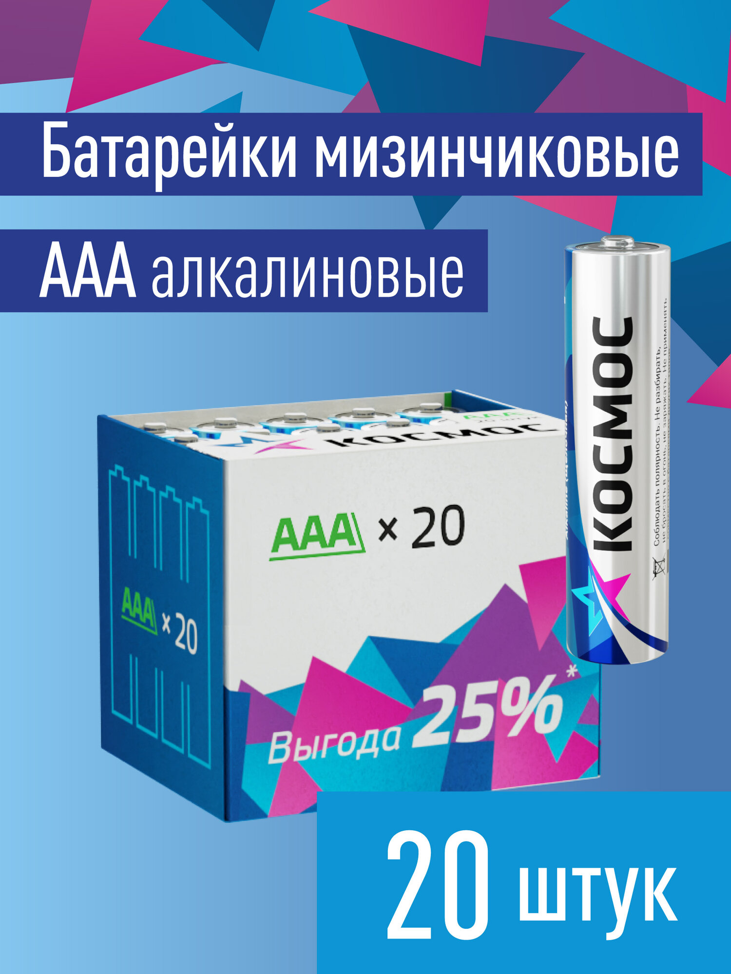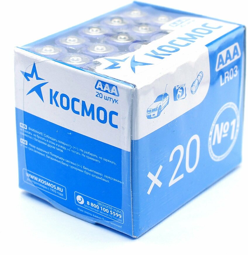 Набор алкалиновых батареек космос LR03, тип ААА, 20 штук. Алкалиновые батарейки ААА используется для питания устройств с низким и средним потреблением энергии: фонари, мышки, клавиатуры, вспышки, пульты дистанционного управления, детские (и не только ; D ) игрушки и т. д.Батарейки алкалиновые Космос - это оптимальный выбор по соотношению цены и качества. Элементы питания разработаны с лучшими характеристиками разряда в большинстве потребителей с высоким и средним энергопотреблением. Батарейки Космос LR03 - это надежный элемент питания с конструкцией высокой прочности. Мизинчиковые батарейки Космос герметичные, хорошо держат заряд в пассивном состоянии. Изделие эксплуатируется в широком диапазоне температур от -30 °С до 50 °С. Срок хранения – 7 лет.