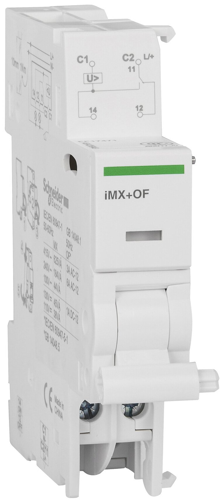 iMX+OF расцепительитель 100-415В АС (акти 9). Вспомогательный контакт iMX+OF. Работает совместно с контактом сигнализации положения «включено – отключено». Снабжён контактом OF для сигнализации положения «включено» или «отключено» соответствующего аппарата. Возможно аварийное отключение кнопкой с замыкающим контактом. Присутсивует дистанционная сигнализация положения соответствующего аппарата. Устанавливается слева на автоматы iC60, адвт iDPN Vigi и УЗО iID.