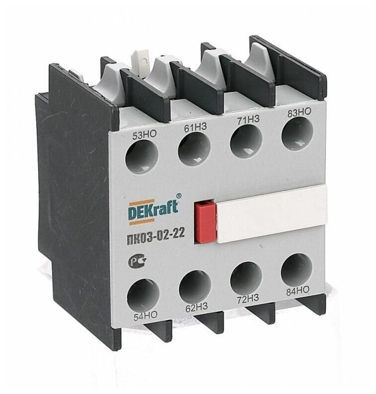 Приставка контактная серии ПК-03-02 для контакторов КМ-103 DEKraft; кол-во контактов - 2НО+2НЗ; ном. ток – 10 А; ном. напряжение – до 690 В; установка – с лицевой стороны; степень защиты – IP20. Приставки контактные предназначены для увеличения количества вспомогательных контактов контактора. Контактные приставки механически соединяются с контакторами и фиксируются при помощи защелки. Приставка подходит для использования с контакторами других производителей.