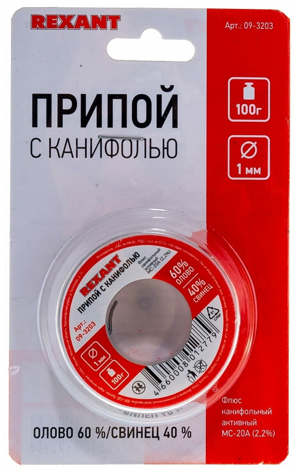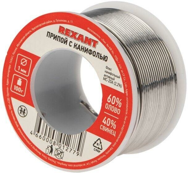 | Особенности | Припой с канифолью 100 гр. d=1.0 мм (Sn60 Pb40 Flux 2.2%) |