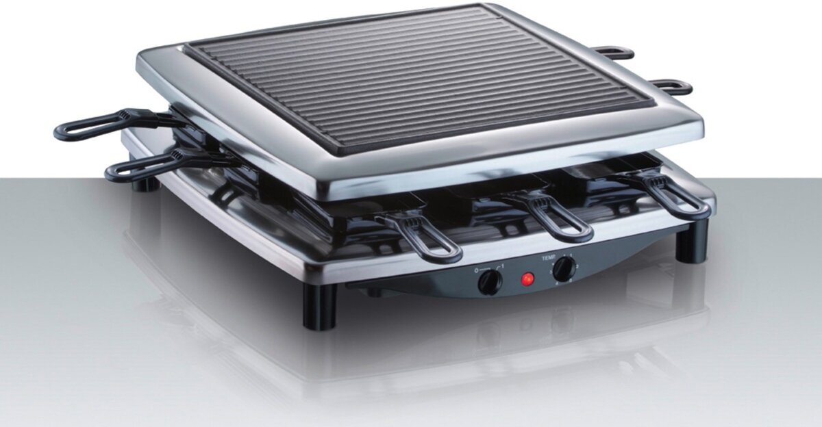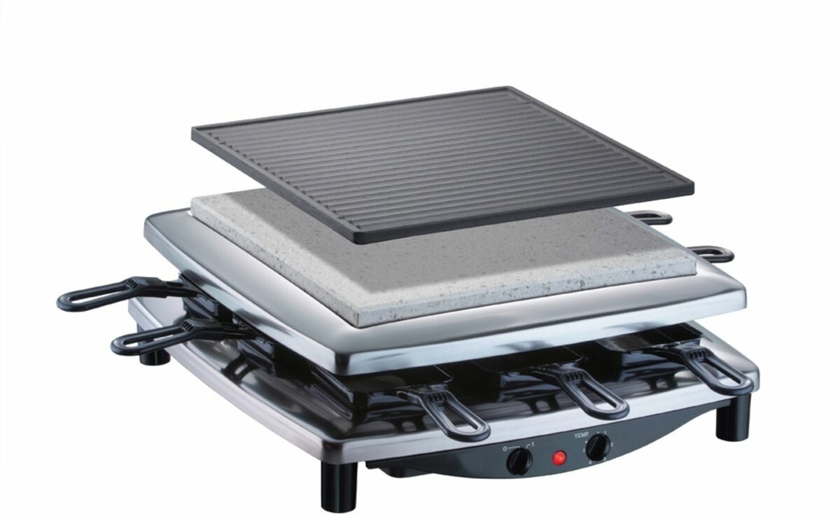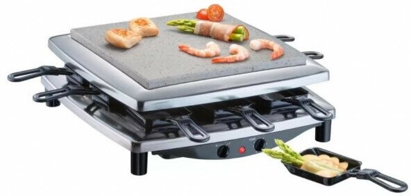 Электрогриль на каменной поверхности и 8 порционных противней в раклетнице Steba RC 3 plus chrom. Такие небольшие сковородки позволяют приготовить блюда на 8 персон и одно большое для всех на камне, что придаст особую изюминку домашней кулинарии.