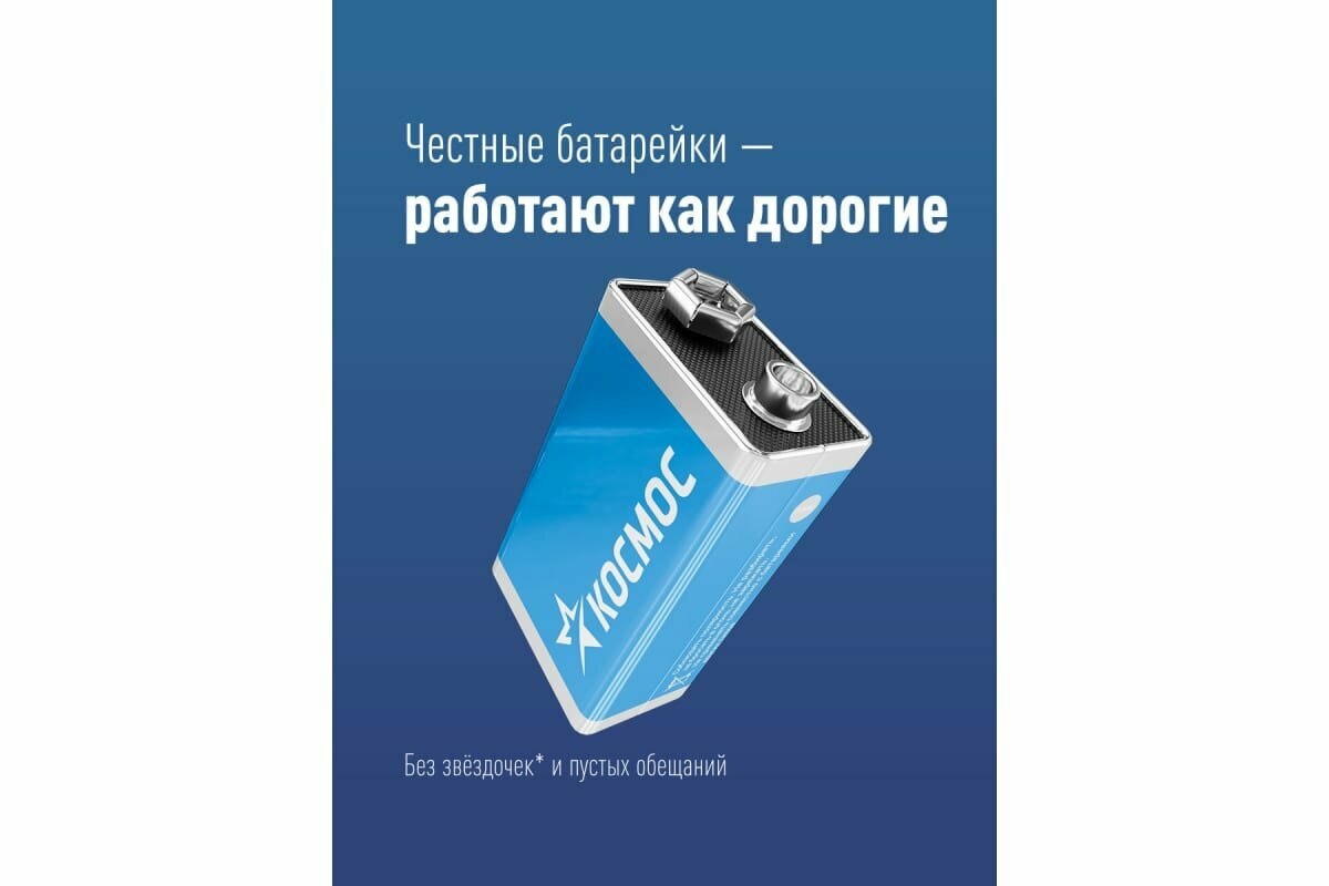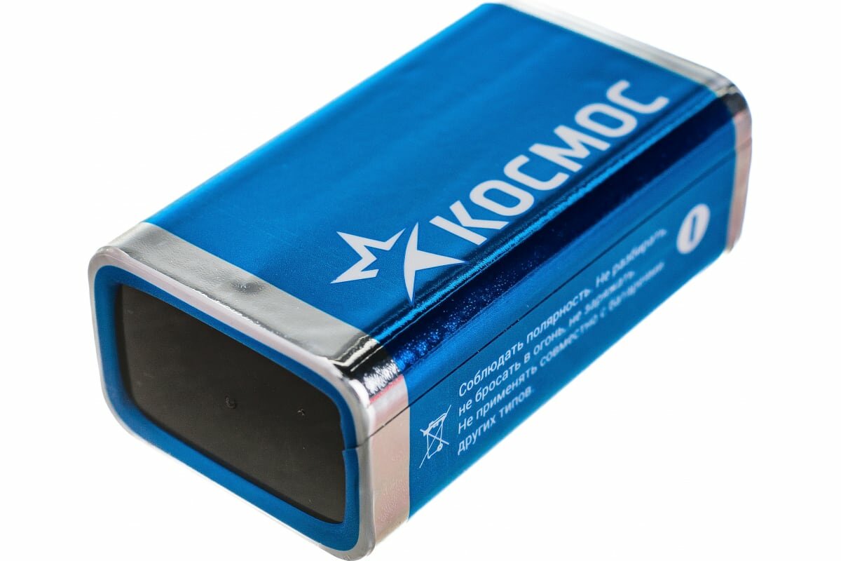 Алкалиновая батарейка 9V (крона) LR 6LR61 КОСМОС используется для питания игрушек, портативных металлодетекторов, пожарных сигнализаций и других приборов. Изделие эксплуатируется в широком диапазоне температур от -30 °С до +50 °С. Срок хранения – 7 лет.