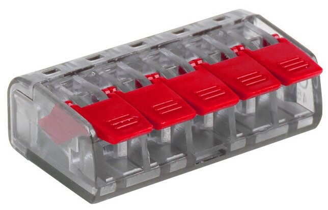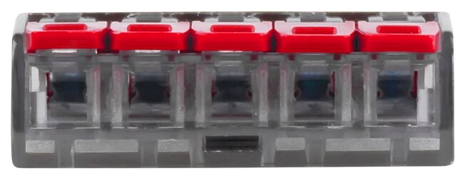 Клемма строительно-монтажная СМК 221-415 5-проводная 0.2-4кв. мм (уп.50шт) PROxima EKF plc-smk-221-415Клеммы СМК с пастой EKF PROxima предназначены для присоединения и ответвления однопроволочных проводников из меди и алюминия или многопроволочного медного провода с наконечником в электрических цепях переменного тока с частотой 50 Гц напряжением до 400 В. Клеммы применяются в распределительных коробках. Удобство данных клемм заключается в безвинтовом креплении проводников (используется подпружиненная стальная пластина с антикоррозионным покрытием). Качество подключения не зависит от квалификации электромонтажника. Каждый проводник имеет отдельное клеммное место. Контактная паста автоматически снимает окисную пленку с алюминиевых проводов и предохраняет их от повторного окисления.