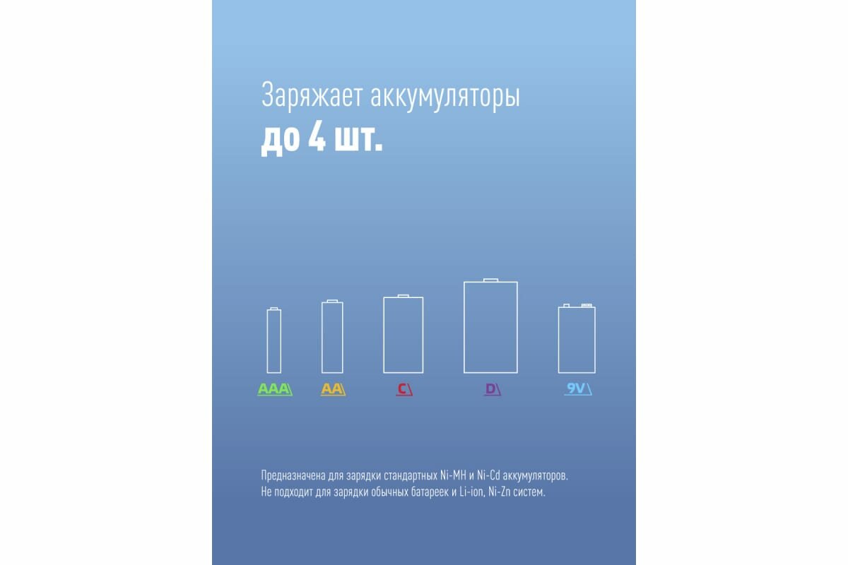 | Типоразмер заряжаемых аккумуляторов | АА, ААА, С, D, крона (9V) |