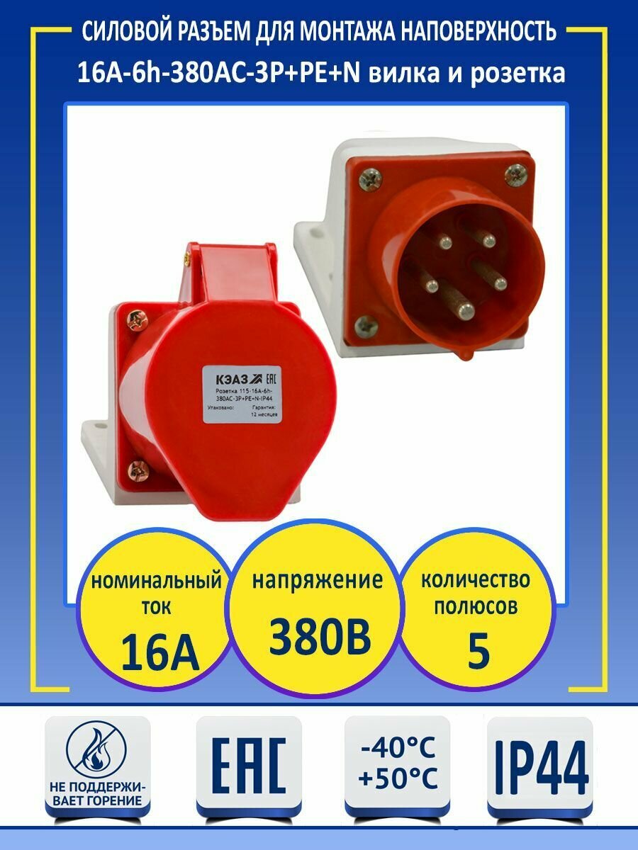 Сервис сравнения цен СкидкаГИД предлагает сравнить цены на товар «222755 Розетка для монтажа на поверхность 115-16А-6h-380AC-3P+PE+N-IP44 КЭАЗ»