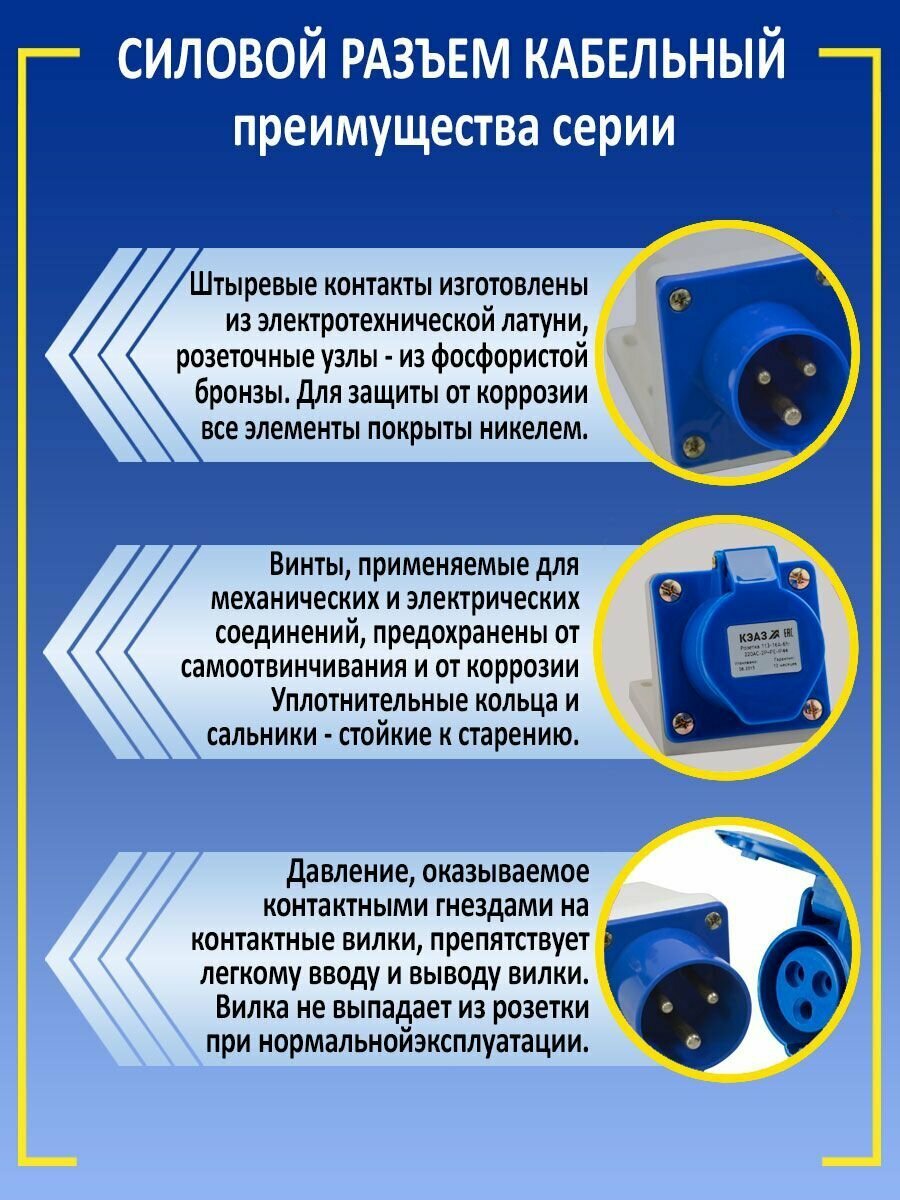 Силовой 5 полюсный разъем на номинальный ток 16А и рабочее напряжение переменного тока 380В предназначен для подключения бытового и промышленного оборудования к электросети. Силовой разъем для монтажа на поверхности 16А-6h-380AC-3P+PE+N-IP44 состоит из вилки (соединителя со штыревыми контактами) и розетки (элемента с гнездовыми контактами), при соединении которых происходит замыкание электрической цепи и электроприбор начинает работать. Штыревые контакты силового разъема изготовлены из электротехнической латуни, розеточные узлы - из фосфористой бронзы. Для защиты от коррозии все элементы покрыты никелем. Винты, применяемые для механических и электрических соединений, предохранены от самоотвинчивания и коррозии. Давление, оказываемое контактными гнездами на контактные вилки, препятствует легкому вводу и выводу вилки. Вилка не выпадает из штепсельной розетки при нормальной эксплуатации. Степень защиты IP44 позволяет эксплуатировать устройство во влажной и загрязненной пылью среде. Корпус и изолирующие детали и выполнены из термостойкого материала, не поддерживающего горение.Основные характеристики:Количество полюсов - 5Номинальный ток - 16 АНоминальное рабочее напряжение переменного тока - 380 ВПоложение заземляющего контакта - 6h Степень защиты - IP44 Соответствует ГОСТ 30849.1-2002