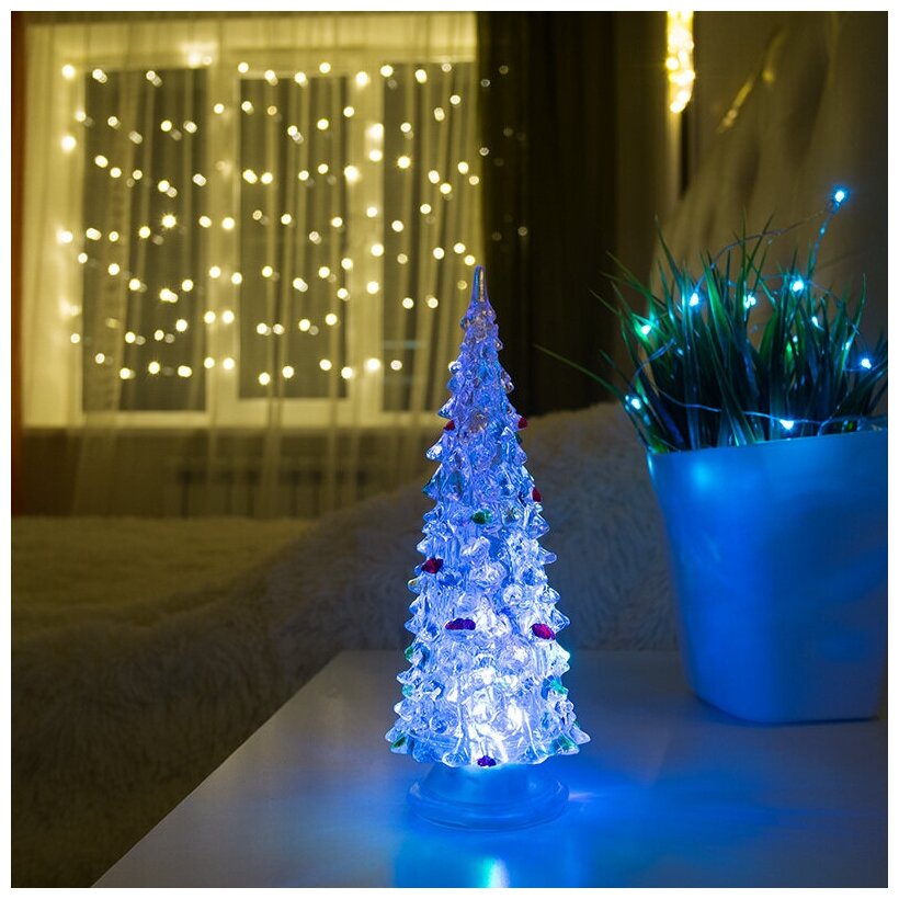 Главный символ Нового года выполнен из ударопрочного пластика. Елочка может использоваться в качестве портативного ночника и светильника: при работе бесшумна. Предусматривает настольную установку на ровной поверхности. Светодиод наполняет пространство разноцветным свечением, создавая особый уют.