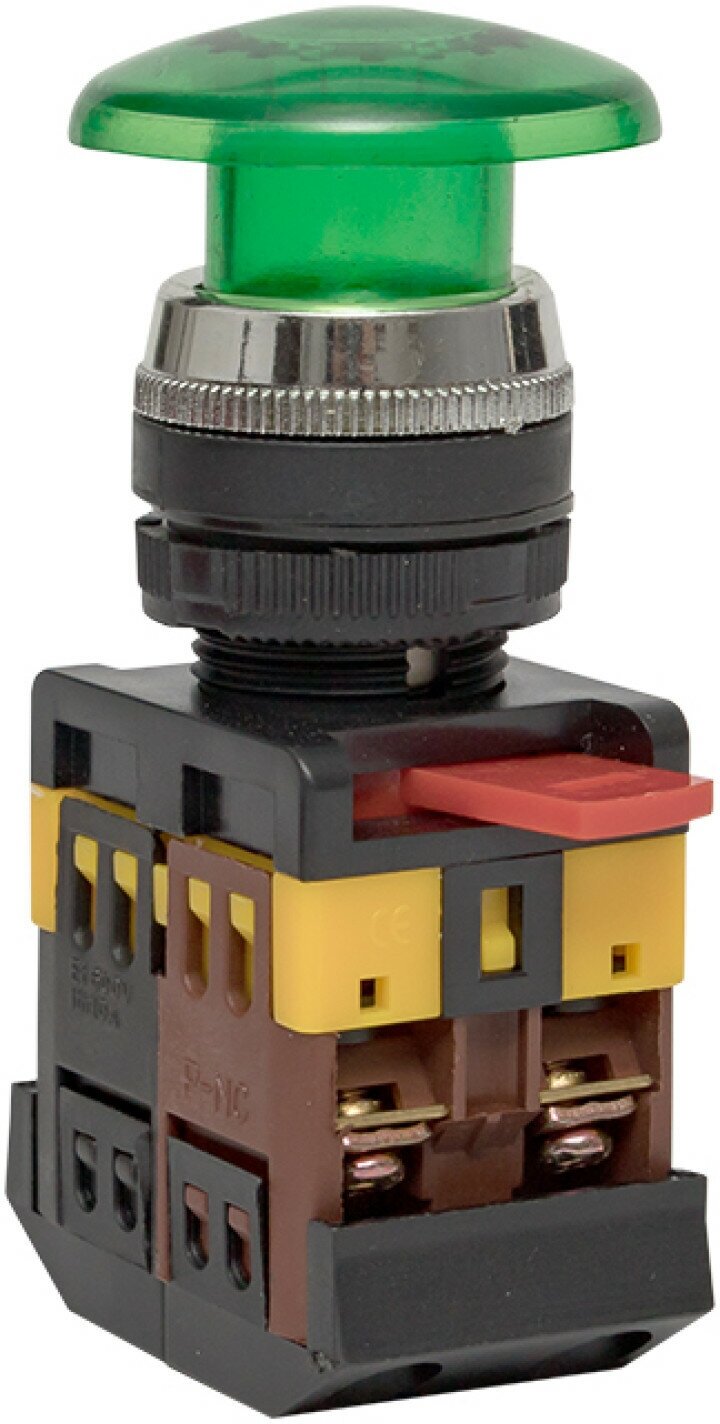 Кнопки типа "Грибок" применяются в электрических цепях переменного тока частотой 50/60 Гц с напряжением до 660 В и постоянным напряжением до 400 В. Исполнение такого типа ( активная часть выступает) позволяет простым нажатием быстро подать управляющий сигнал на оборудование. Включение кнопки облегчается за счет большой площади поверхности нажатия.