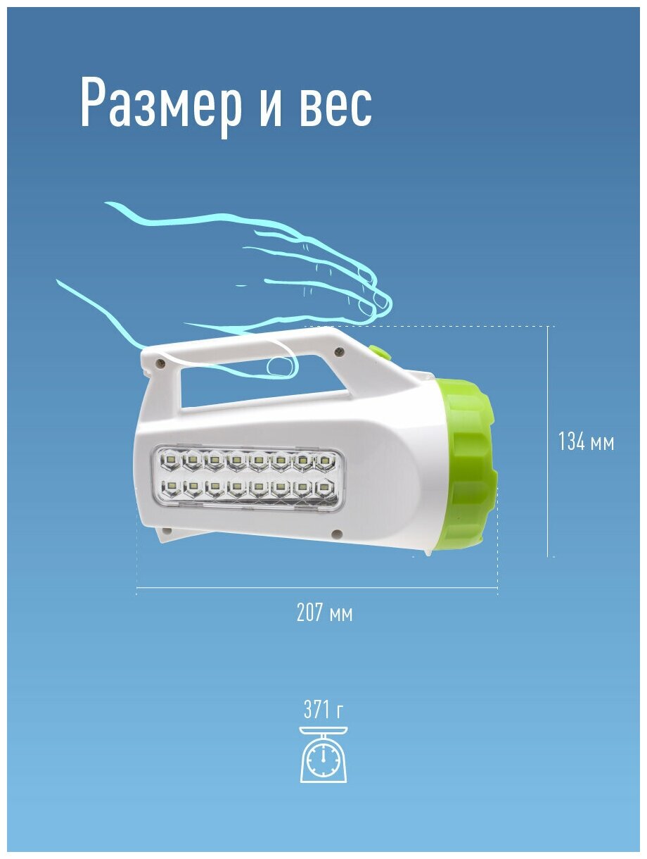 Стандартный бытовой фонарь 2-в-1 со встроенным светильником на 180 градусов. Совмещает луч фонаря (светит как фара автомобиля, направленный свет с ярким пятном засветки в центре) и широкий свет (освещает широкое пространство с одной стороны, удобен для работы вблизи). Длина луча – 250 м, время беспрерывной работы – до 6 ч. Площадь освещения светильника - 24 кв.м, время беспрерывной работы – до 8 ч. Надежный свинцово-кислотный аккумулятор 4В 1200 мАч, подзарядка от сети. Упакован в коробку с подробной информацией о модели и схемой фонаря.
