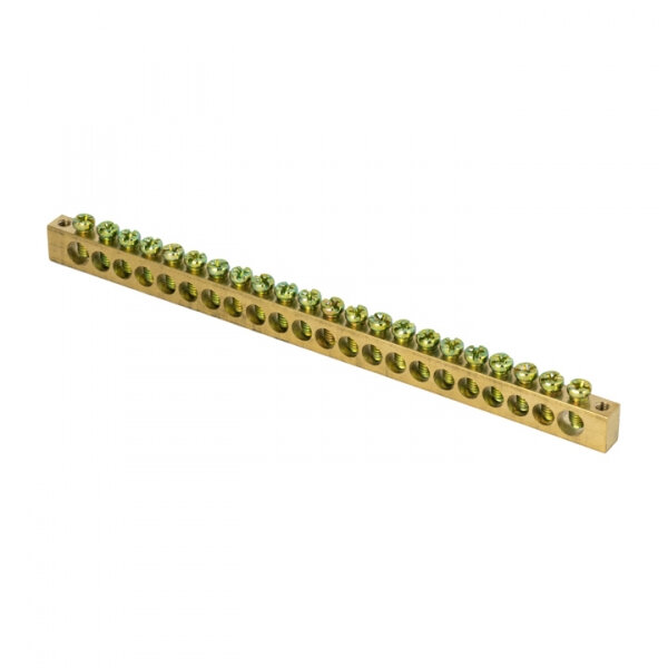 ОПИСАНИЕ. Шины предназначены для присоединения нулевых проводников (шина N) и заземления (шина PE). Шины выполнены из латуни и никелированной латуни. Нулевая шина устанавливается на изоляторе. ПРЕИМУЩЕСТВА. Изоляторы изготовлены из пластика, не поддерживающего горение. Материал контактной части: качественная латунь. Прижимные винты изготовлены из никелированной стали. Широкий выбор шин позволяет точно подобрать подходящую под размер установки шину. Скругление контактной части винта предотвращает срез проводника при затяжке. ПРИМЕНЕНИЕ. В шкафах, щитах, сборках. В качестве комплектующих в технологическом оборудовании.