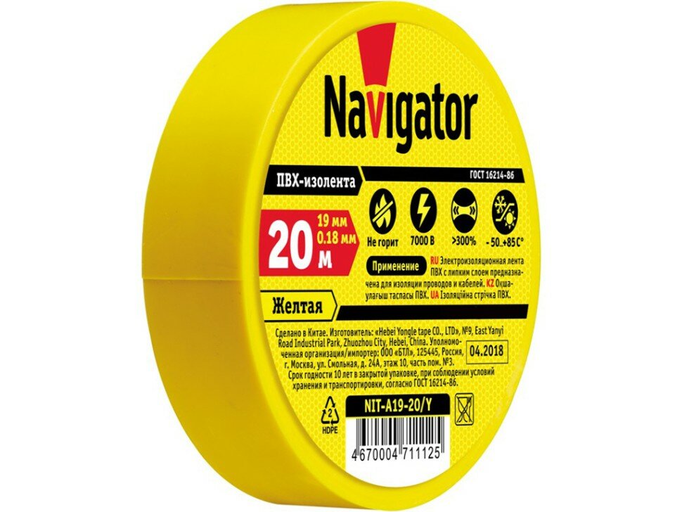 Изолента профессиональная 0,18 ? 19 мм.Электроизоляционная лента Navigator серии NIT на ПВХ основе предназначена для изоляции, соединения, цветной маркировки и защиты от повреждений проводов и кабелей. - Электрическая прочность (напряжение пробоя) 7000 В- Относительное удлинение при разрыве 300%.-Соответствует требованиям ГОСТ 16214-86.-Не поддерживает горени.-Липкость 400 с.-Температура хрупкости -50 °С.-Температура эксплуатации -50…+85 °C.