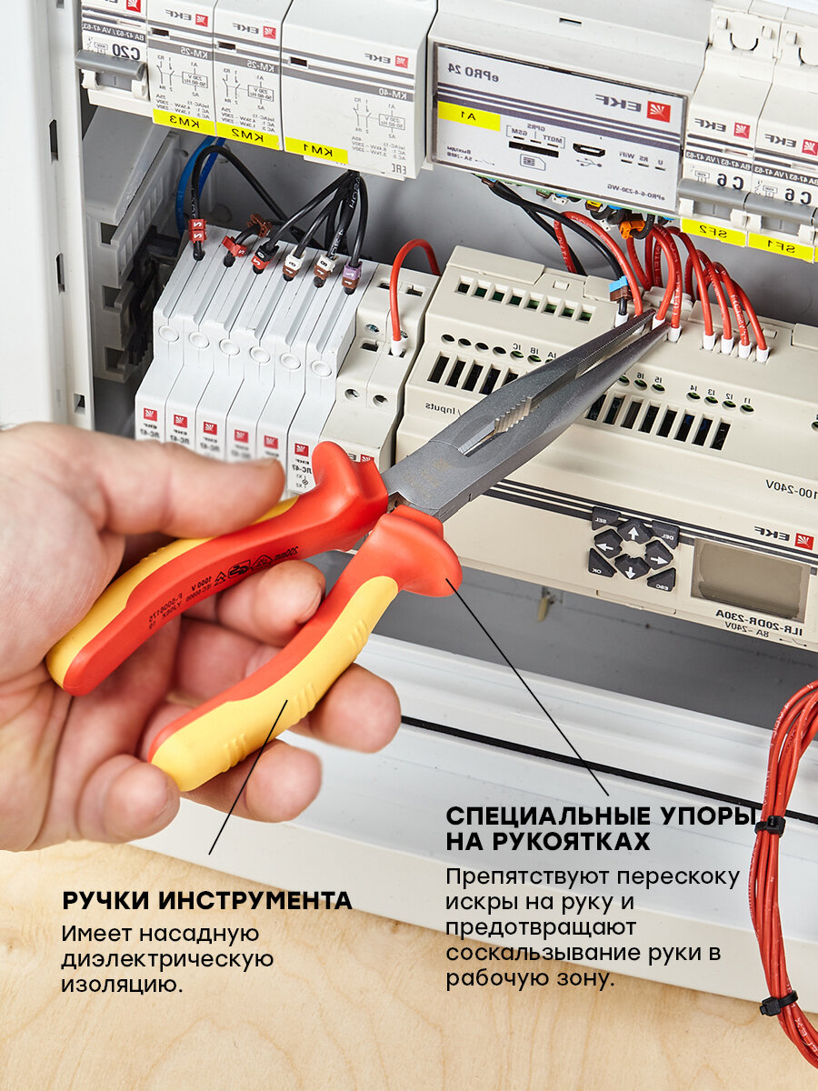ОПИСАНИЕ. Диэлектрический шарнирно-губцевый инструмент – большая группа изделий, необходимых для проведения работ под напряжением до 1000 В. Инструмент серии Master имеет диэлектрическое покрытие(изоляцию) нанесенное методом погружения. Инструмент серии Expert имеет насадную диэлектрическую изоляцию с элементами защиты от соскальзывания. ПРЕИМУЩЕСТВА. Материал рабочей части: инструментальная хром-ванадиевая сталь. Поверхность: матовое никелирование. Режущие кромки дополнительно закалены токами высокой частоты HRC 62. Высококачественный материал и отличная эргономика рукояток. Упоры для защиты от соскальзывания, обеспечивают удобный хват и рычажное усилие, необходимое для осуществления реза. Expert – серия инструментов с улучшенными эксплуатационными характеристиками, которые проходят дополнительную обработку и контроль при производстве. Соответствие нормам IEC 60900:2004. ПРИМЕНЕНИЕ. Пассатижи используют для захвата и удержания плоских и цилиндрических деталей, проводов и элементов крепежа. Наличие режущей кромки позволяет откусывать проволоку и зачищать провода. Бокорезы предназначены для разрезания проволоки, проводов, гвоздей, прутьев. Различаются по форме и размеру рабочей части. Кабельные ножницы применяют для резки медных или алюминиевых проводов/кабелей. Длинногубцы/Длинногубцы изогнутые используются для захвата и удержания мелких элементов, проволоки, колец, винтиков и выполнения различных работ в труднодоступных местах. Круглогубцы применяют для закручивания или выпрямления проволоки и тонких металлических изделий. Клещи переставные предназначены захвата и опрессовки деталей, сгиба труб, демонтажа винтовых соединений и т. д.