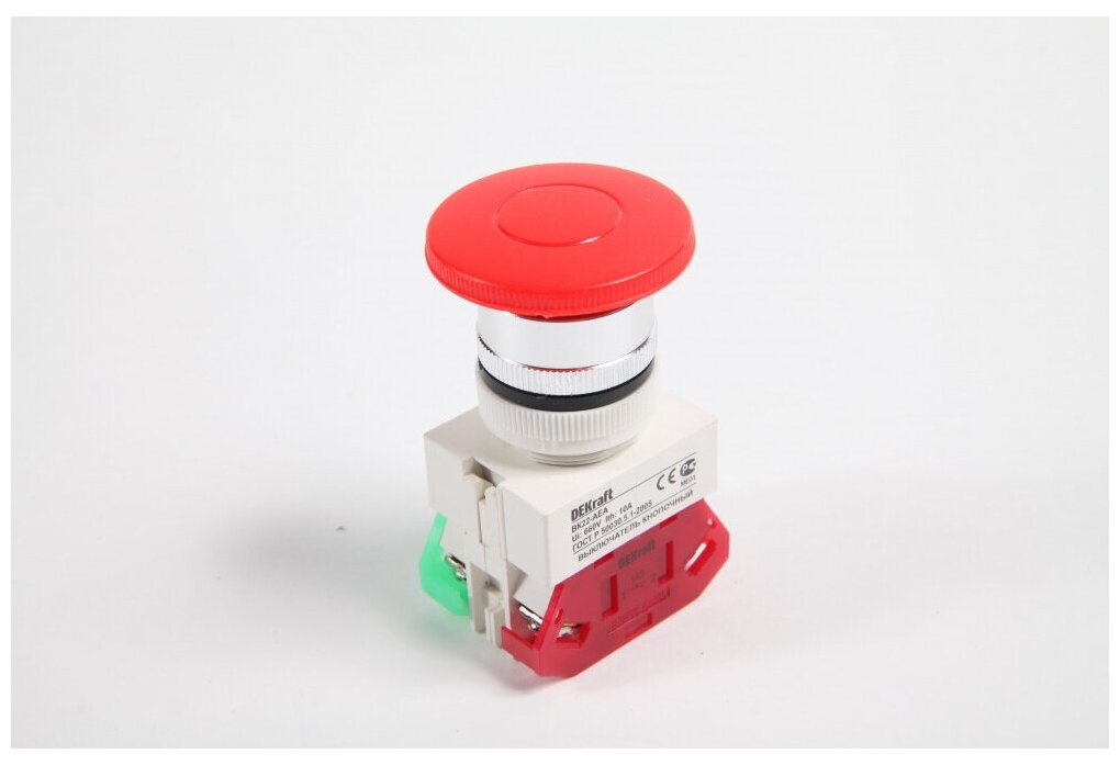 Выключатель кнопочный серии ВК-22 DEKraft; грибовидный толкатель с фиксацией (расфиксация поворотом); красный; без индикации; ном. ток 10 А; установка - на панели или двери; степень защиты - IP54; подключение - винтовыми зажимами. Выключатели кнопочные ВК-22 предназначены для коммутации электрических цепей и индикации состояния электрических цепей. Применяются в сетях переменного тока частотой 50/60 Гц с напряжением до 660В. Могут устанавливаться на подвижных и неподвижных частях стационарных установок.