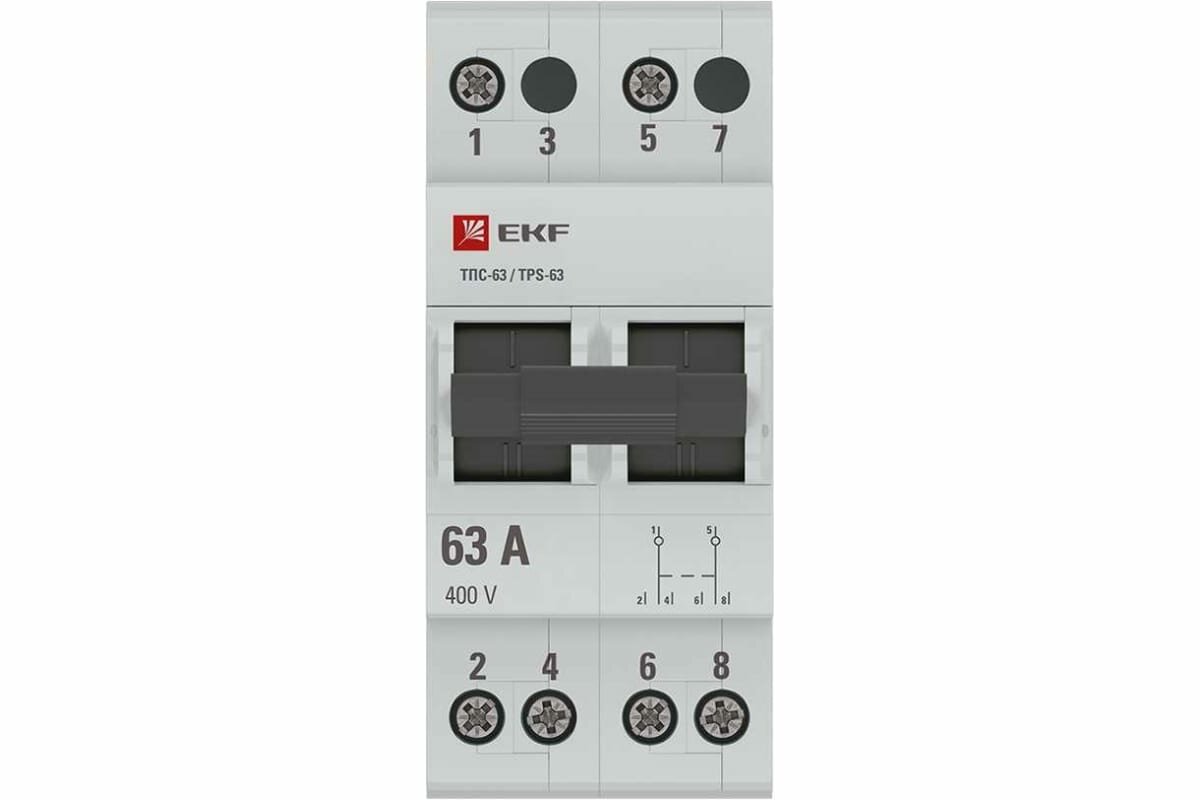 **Переключатель EKF** предназначен для переключения питания с одной линии на другую при возникновении перегрузки сети. Применяется для проведения тока. Подходит для оперативного включения электрической цепи. Максимальное сечение провода составляет 16 мм². Эксплуатируется при температурах от -25°C до 50°C. Подходит для пломбировки.
