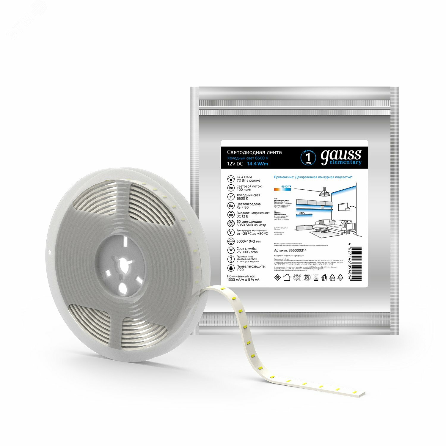 355000314 Лента LED Elementary 5050/60-SMD 14.4W 12V DC холодный белый IP20 (ZIP Bag 5м) Gauss Elementary 355000314