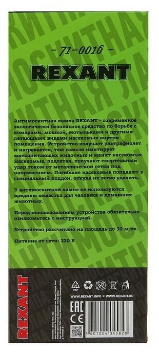 **Антимоскитная лампа Rexant** — средство для защиты от насекомых, москитов, мошек, мотыльков внутри помещений. Принцип действия устройства заключается в излучении ультрафиолетовых лучей, нагревании и привлечении всем этим насекомых. Подлетая ближе, они получают чувствительный удар током от металлической сетки под напряжением.